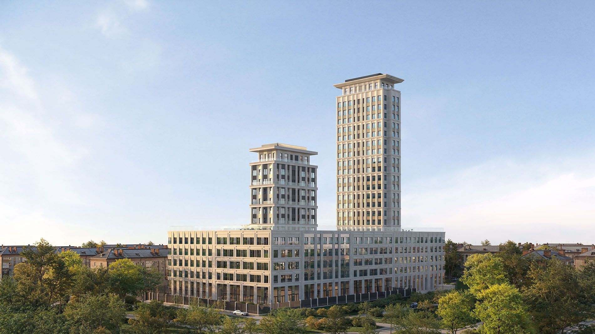 Комплекс состоит из 9 секций: 7 пятиэтажных домов и двух высотных секций — 13 и 22 этажа. Архитектура разработана бюро «СПИЧ» и сочетает неоклассические элементы с современными решениями: строгие формы, симметричный фасад, объёмный «карнизный» силуэт и использование стеклофибробетона, устойчивого к царапинам, морозу и осадкам. Каждая секция имеет уникальный дизайн, а сложная геометрия фасада формирует ниши для открытых балконов.