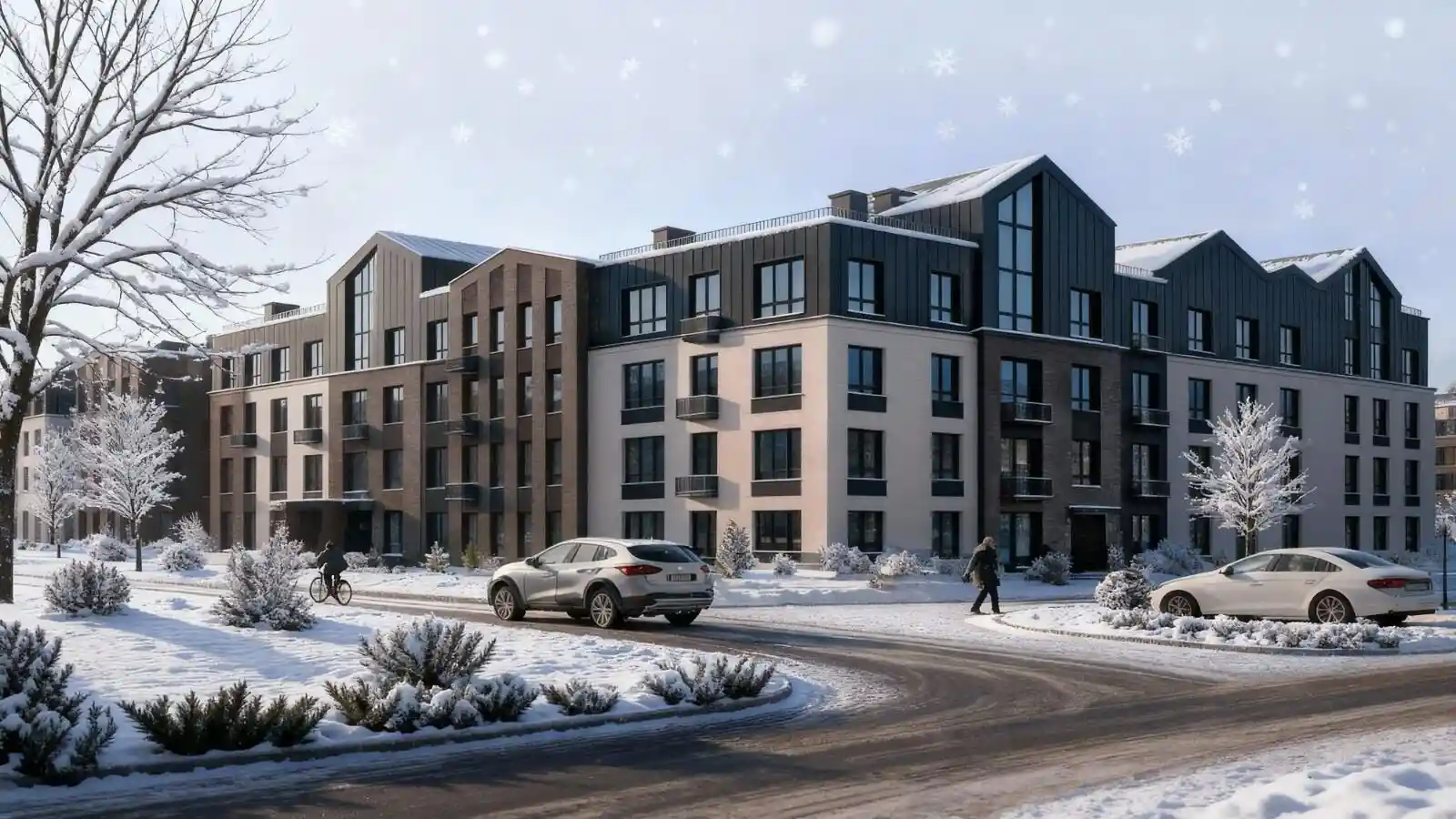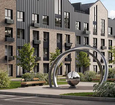 Фасады зданий выполнены в светлых тонах, приближённых к природным: использованы кирпич и дерево, предусмотрены открытые французские балконы и большая площадь остекления. Территория комплекса огорожена и находится под охраной: въезд осуществляется через КПП по пропускам, установлено более 100 камер видеонаблюдения, работает система интеллектуального контроля доступа (СКУД).
