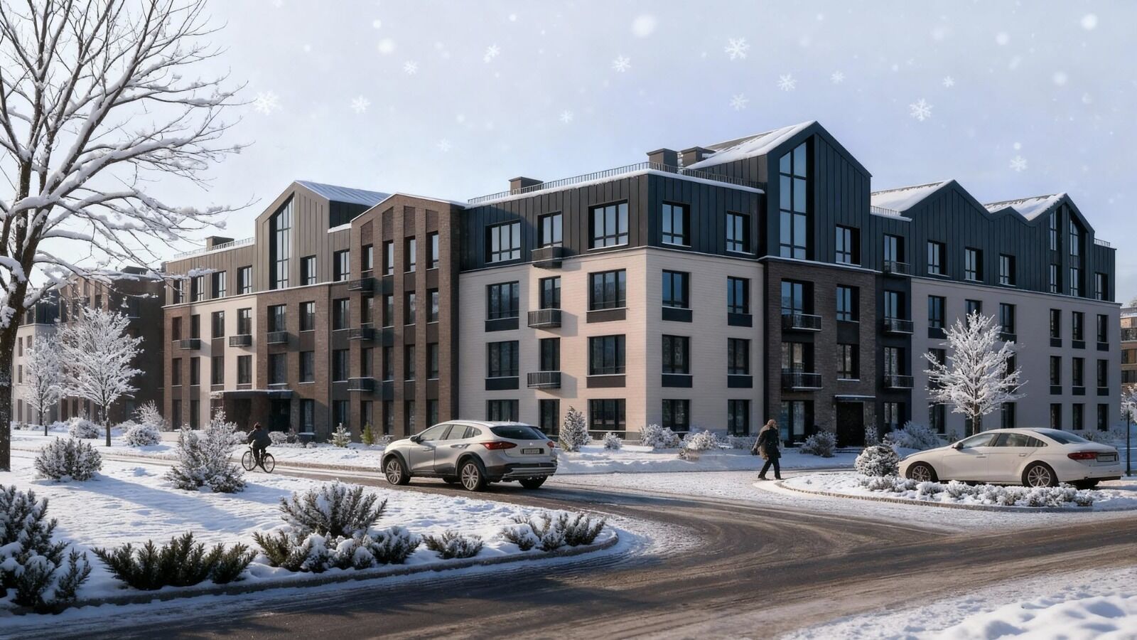 Для автовладельцев предусмотрено 57 гостевых наземных парковочных мест. Внутри комплекса созданы зелёные зоны с пешеходными и велосипедными дорожками, воркаут‑площадки, спортивная зона, спиралевидный лабиринт, универсальный детский комплекс с интерактивным оборудованием, амфитеатр с сценической площадкой, зона для йоги, каток и футбольное поле.