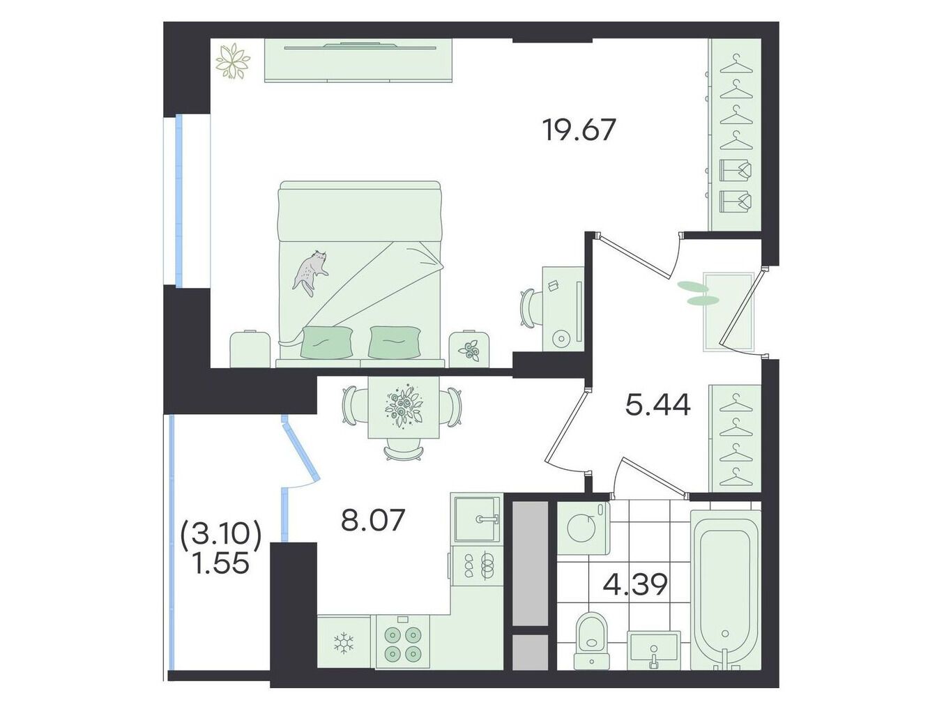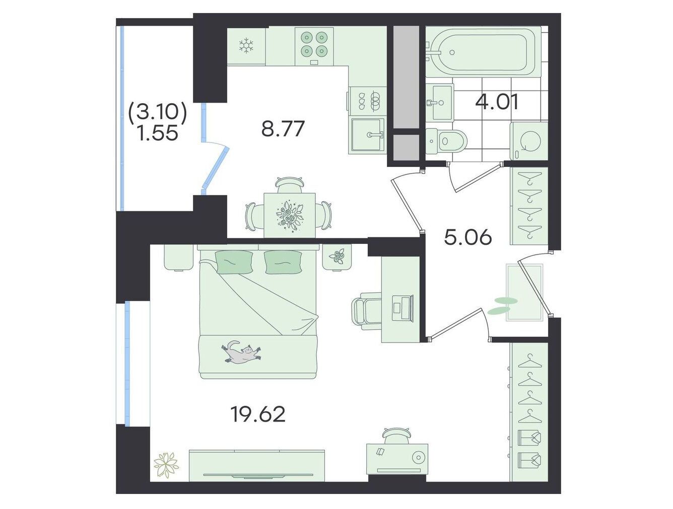 В доме 620 квартир — одно-, двух- и трёхкомнатных. Площадь лотов начинается от 39 м² (для однокомнатных) и доходит до 89,5 м². Высота потолков — 2,72 м. Все квартиры имеют остеклённые лоджии, а в планировках предусмотрены отдельные гардеробные, просторные спальни с видом на лес, детские комнаты и раздельные санузлы. Некоторые квартиры отличаются угловым остеклением балконов, открывающим панорамные виды на природное окружение.
