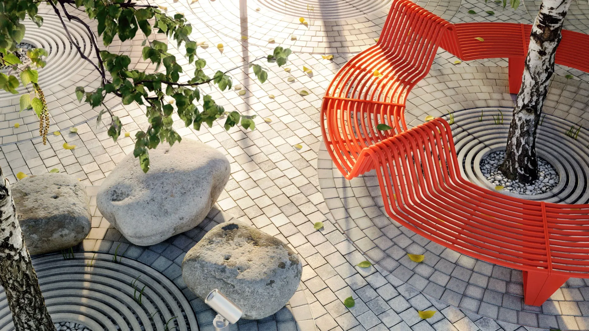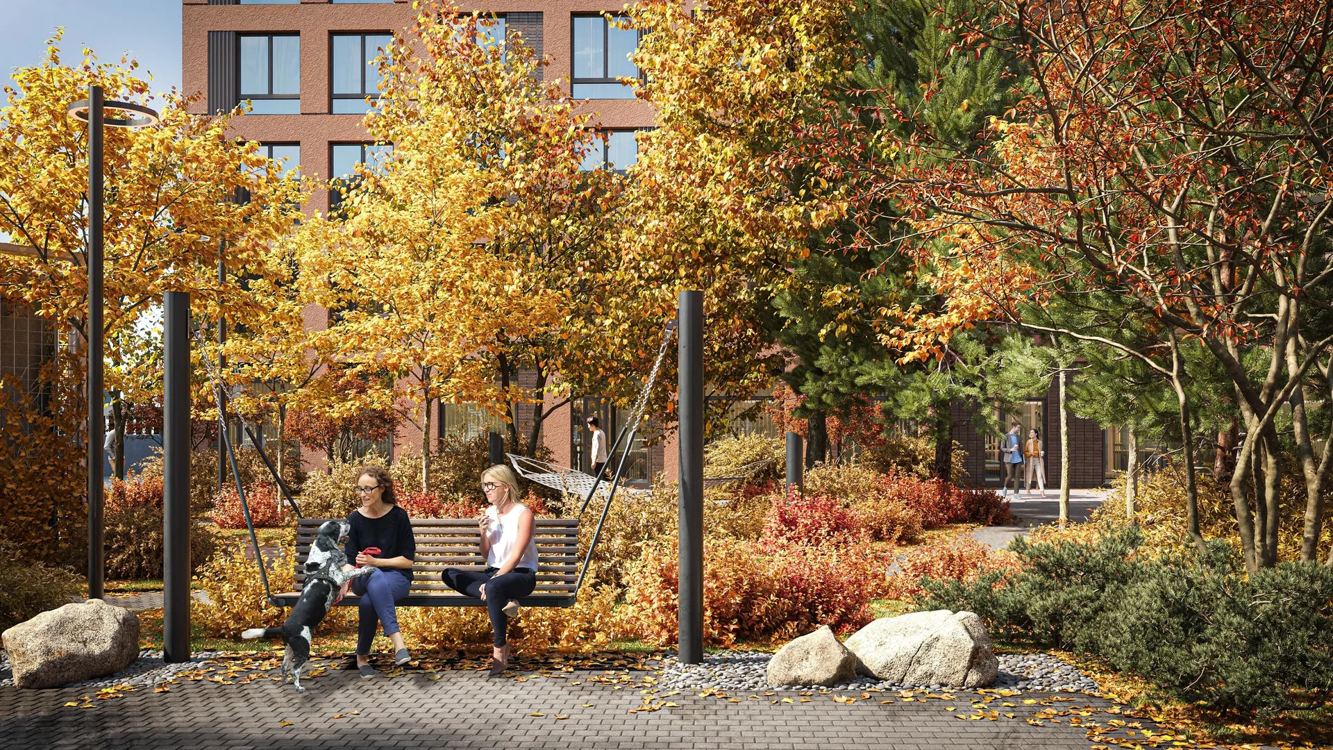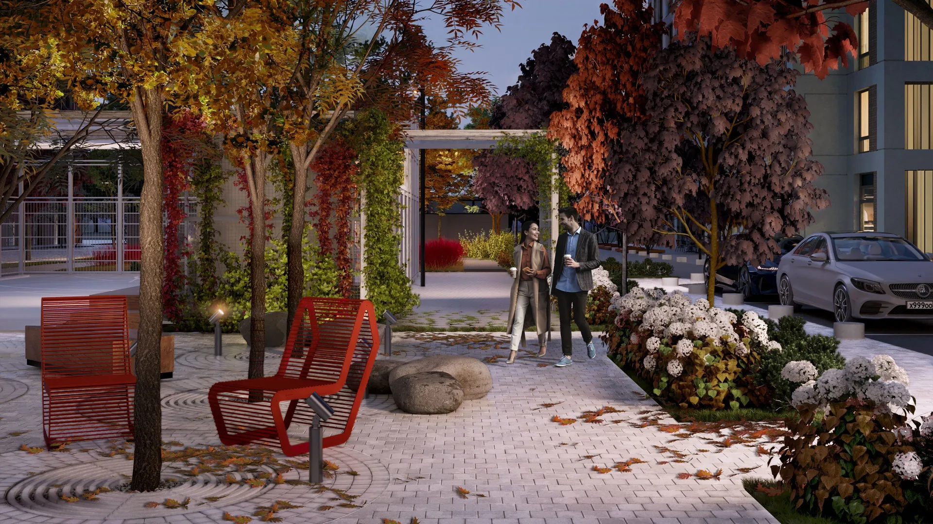 На придомовой территории появится «Семейный сад», будут установлены перголы, под которыми разместятся качели, пуфы, гамаки и столы для работы или перекуса на свежем воздухе. Для детей будет сформирован игровой маршрут, оборудованы детские площадки, установлен декор из природных материалов. Для взрослых предусмотрены площадки для фитнеса и стритбола.