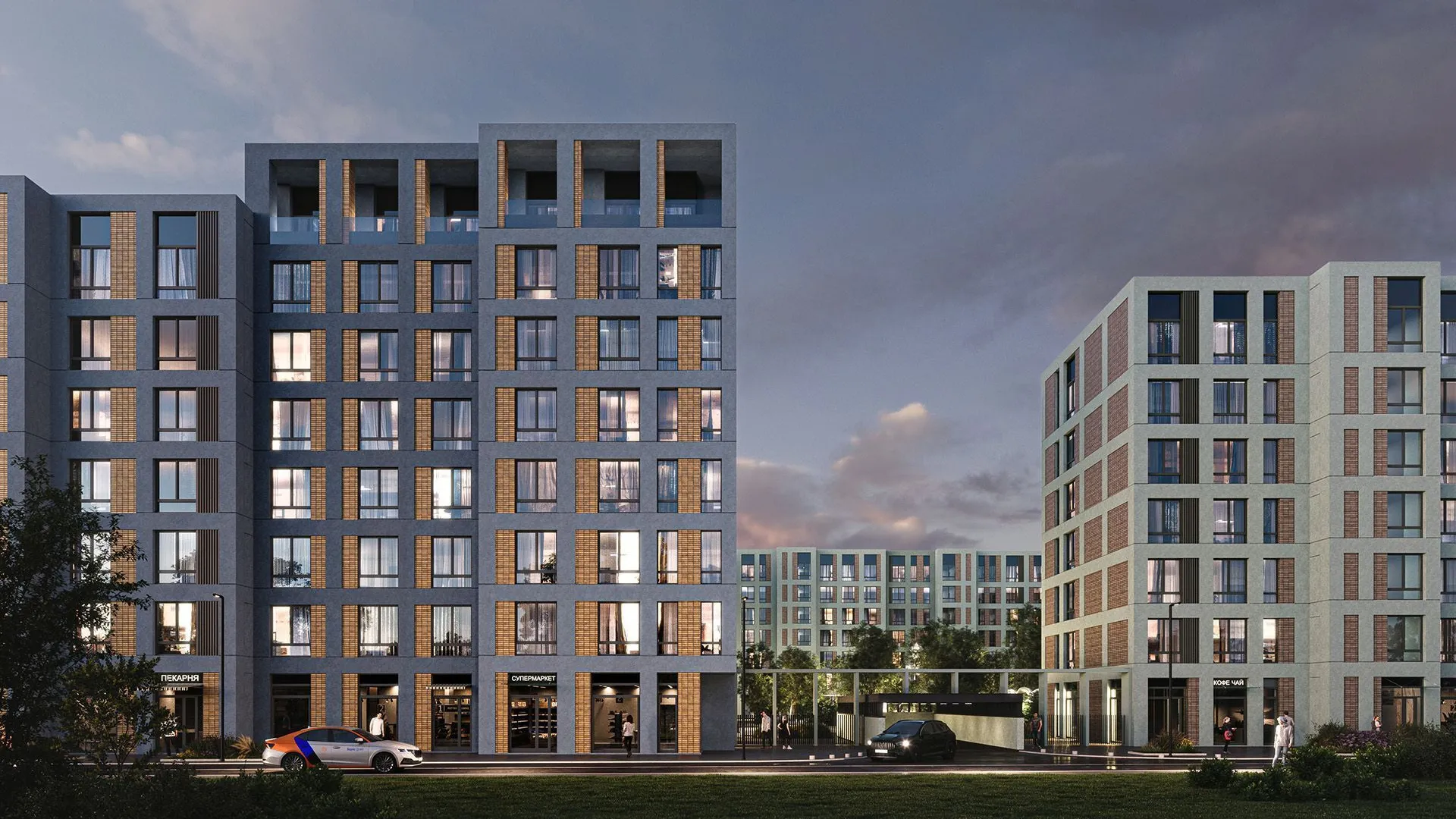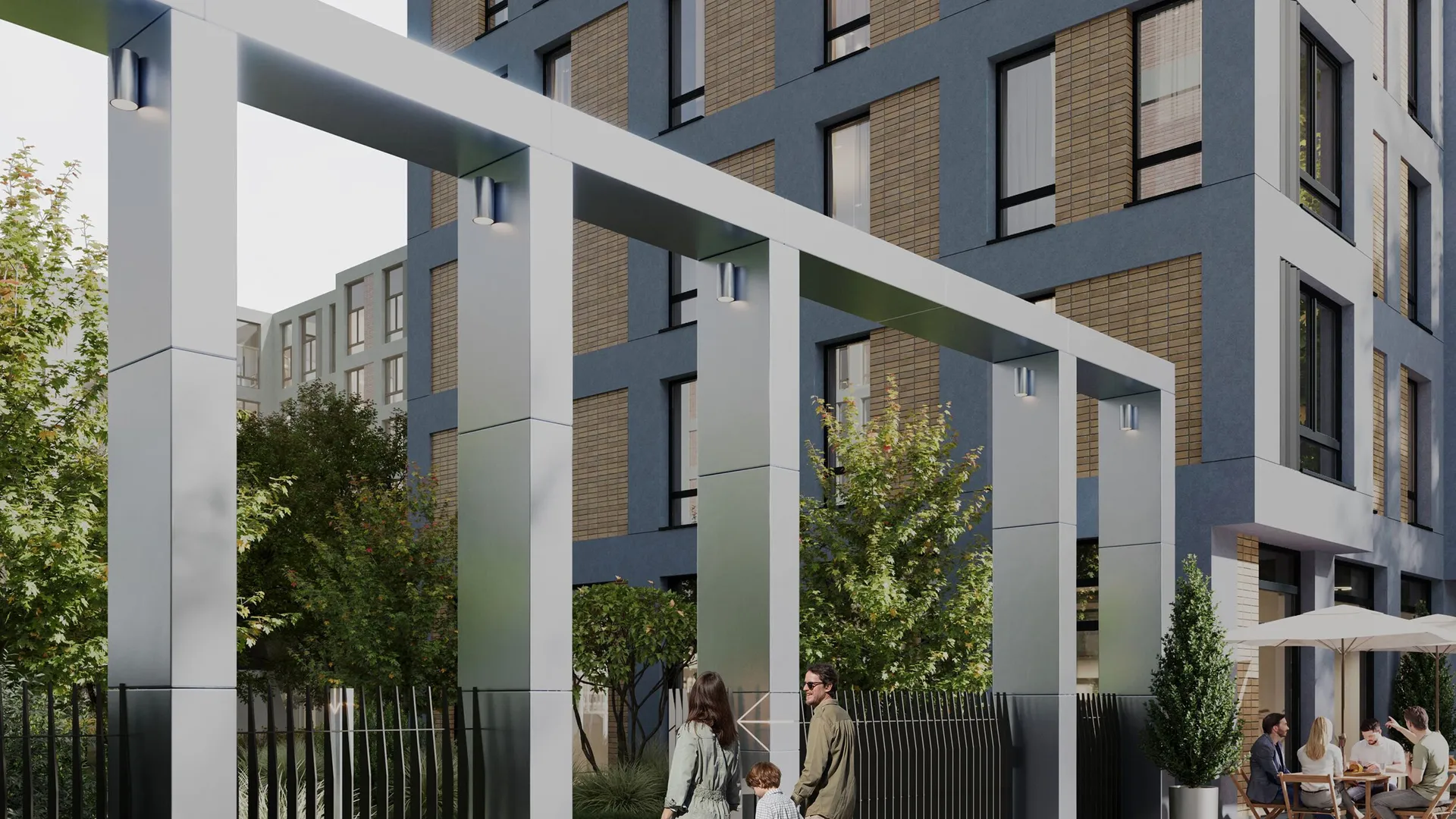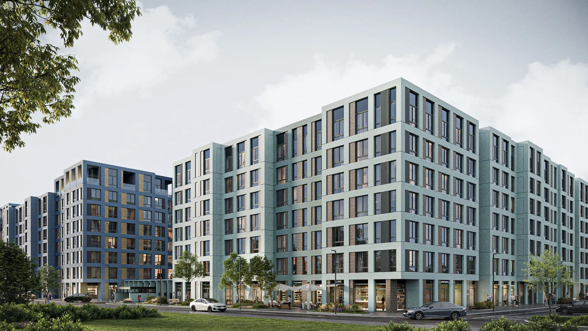 ЖК отличается сдержанной минималистичной архитектурой. Для отделки фасадов будет использовано несколько разных по фактуре и цвету материалов — декоративная штукатурка, клинкерная плитка, металлические панели и стекло.