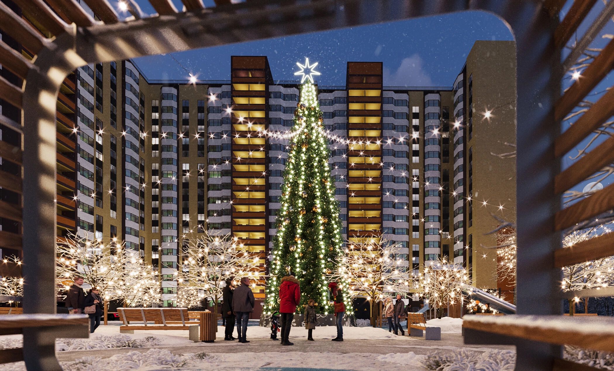 На территории комплекса обустроены 5 детских и 2 спортивные площадки, проложены велосипедные дорожки. Для удобства маломобильных жителей предусмотрены пандусы, понижающие площадки и 6 инвалидных подъёмников. Гостевая парковка рассчитана на 88 мест. Безопасность обеспечивает система видеонаблюдения, также установлена противопожарная система.