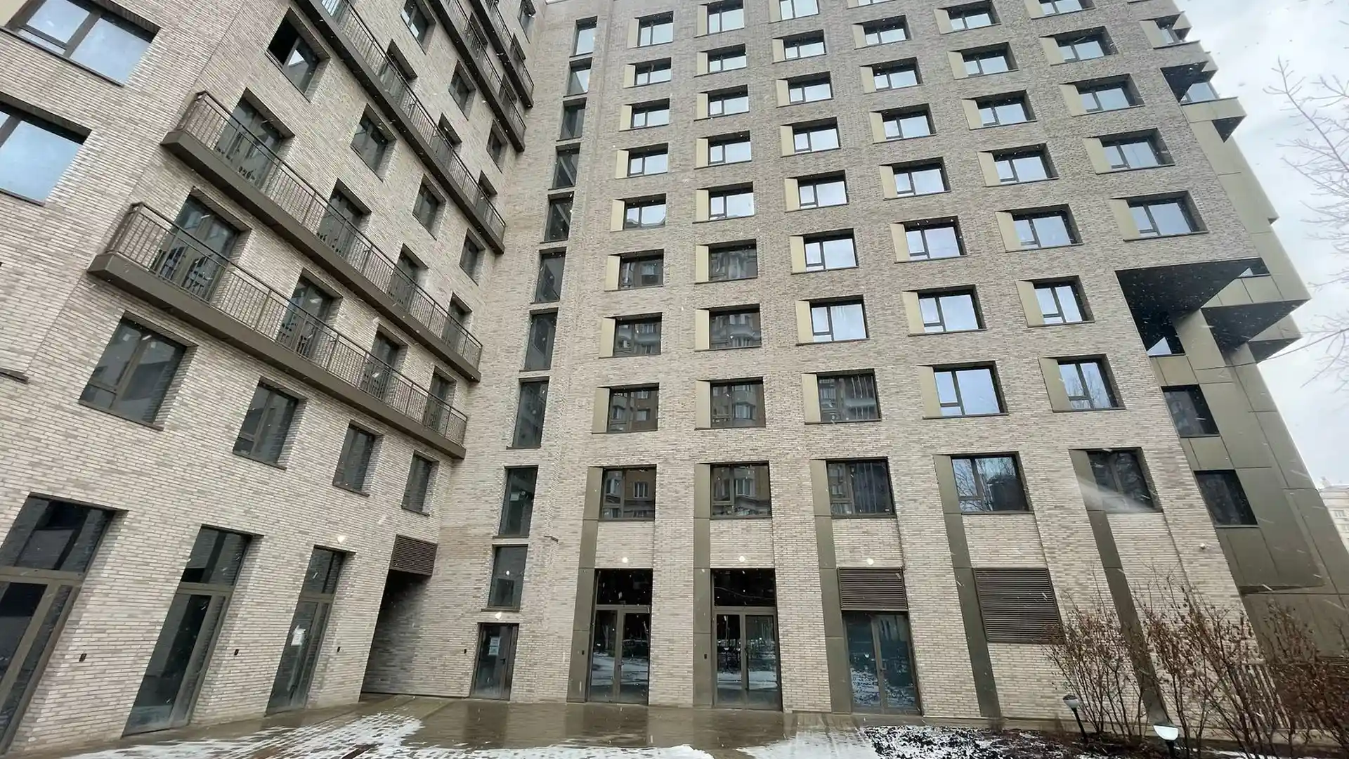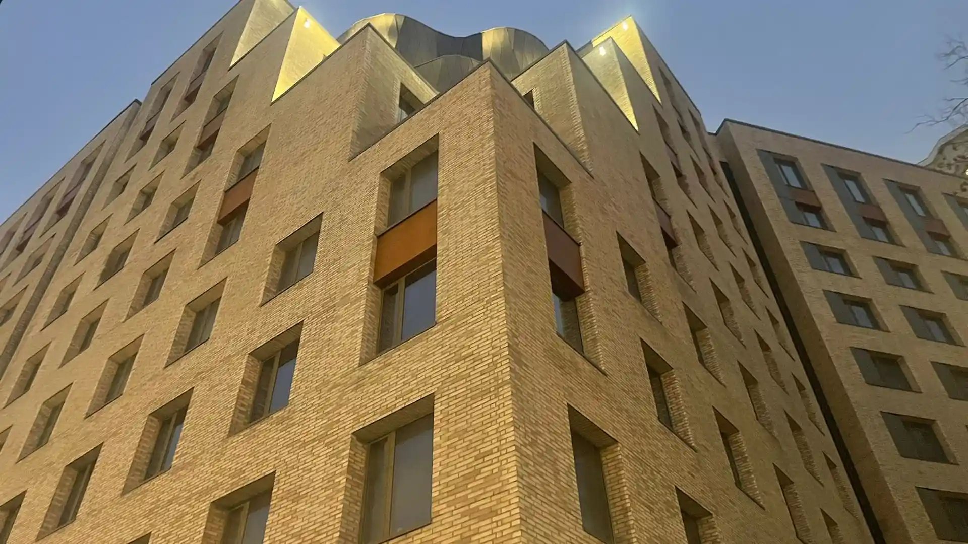 Здание представляет собой 10‑этажный монолитно‑кирпичный дом, архитектура которого выделяется динамичным силуэтом: форма фасада меняется в зависимости от ракурса, а открытые террасы с 5‑го по 10‑й этаж формируют ступенчатый рисунок. Акцентом экстерьера служат изящные элементы золотого цвета, эффектно отражающие солнечный свет и придающие комплексу особый шарм.