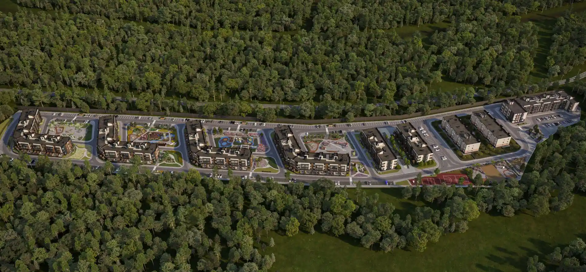Комплекс предлагает 19 локаций для отдыха, включая BBQ-площадку и выход к экотропам леса. Всего на территории будет высажено более 3900 деревьев и кустарников, а также проложено 2 километра дорожек вдоль леса.