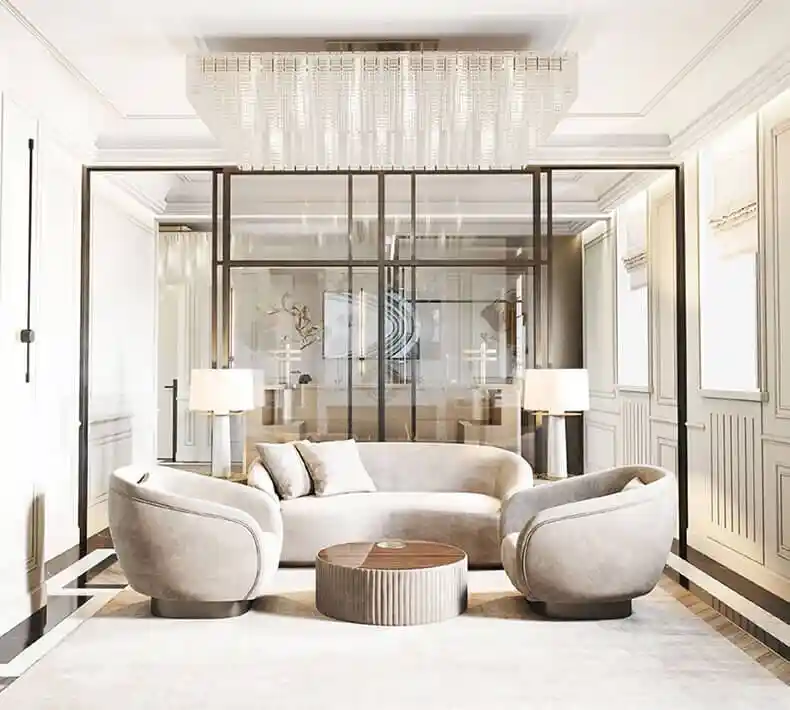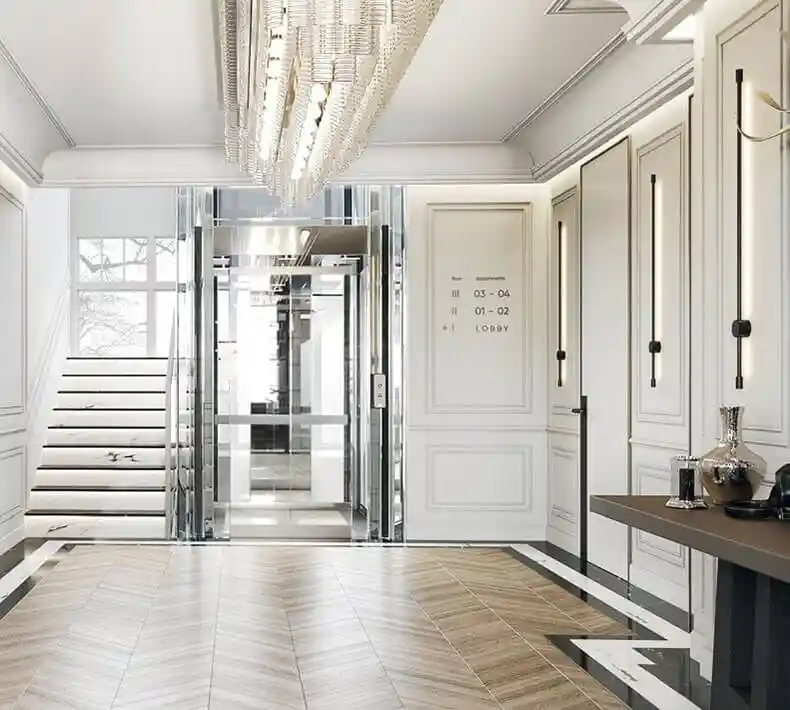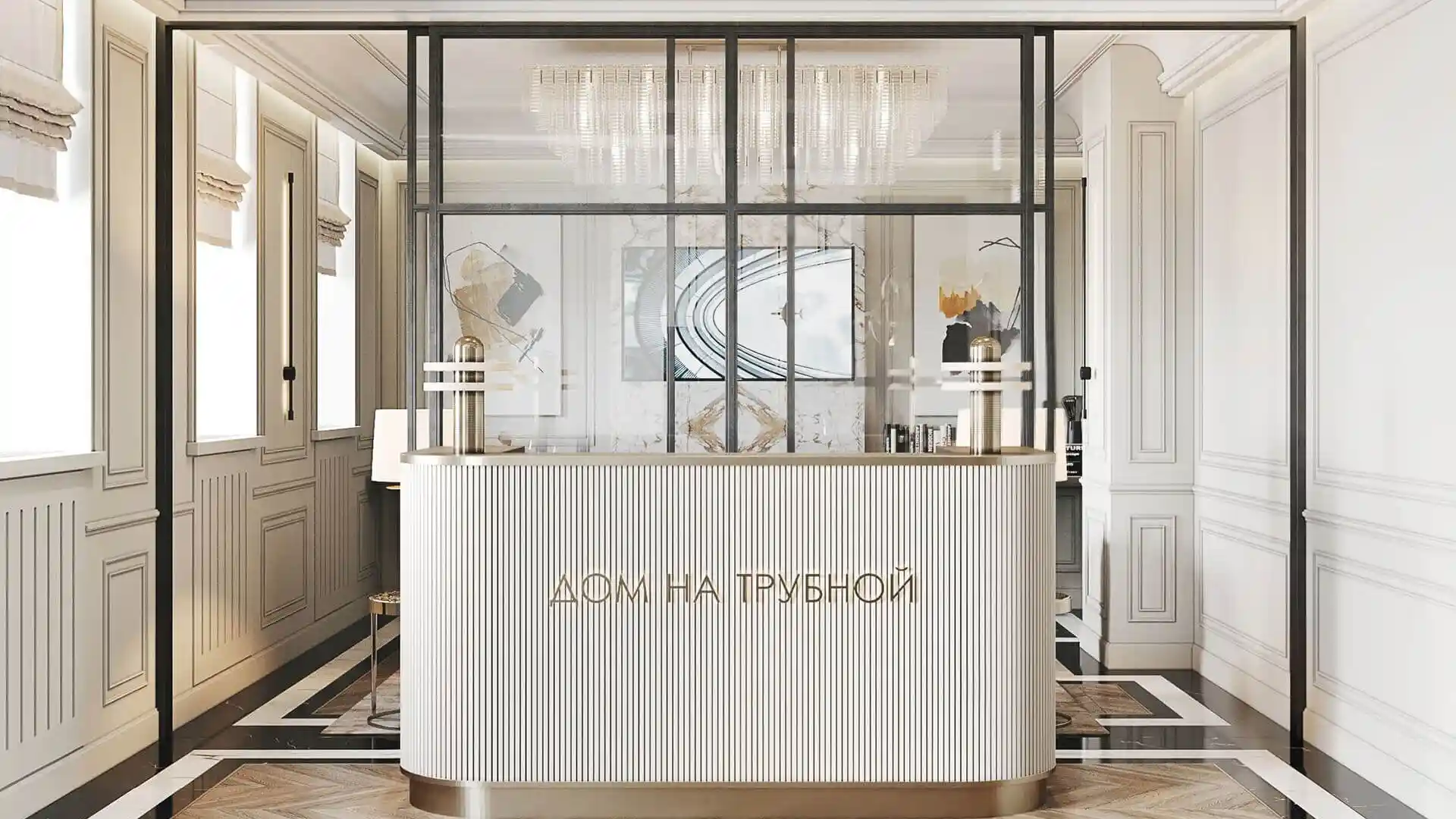 Лобби оформлено в роскошном стиле: использованы натуральный мрамор с латунными вставками и гипсовая лепнина. Центральным элементом интерьера стала хрустальная люстра. В лобби также есть приватная лаунж-зона с камином для отдыха или неформальных встреч. В доме установлен бесшумный лифт, а за стойкой ресепшн дежурит круглосуточный консьерж-сервис.