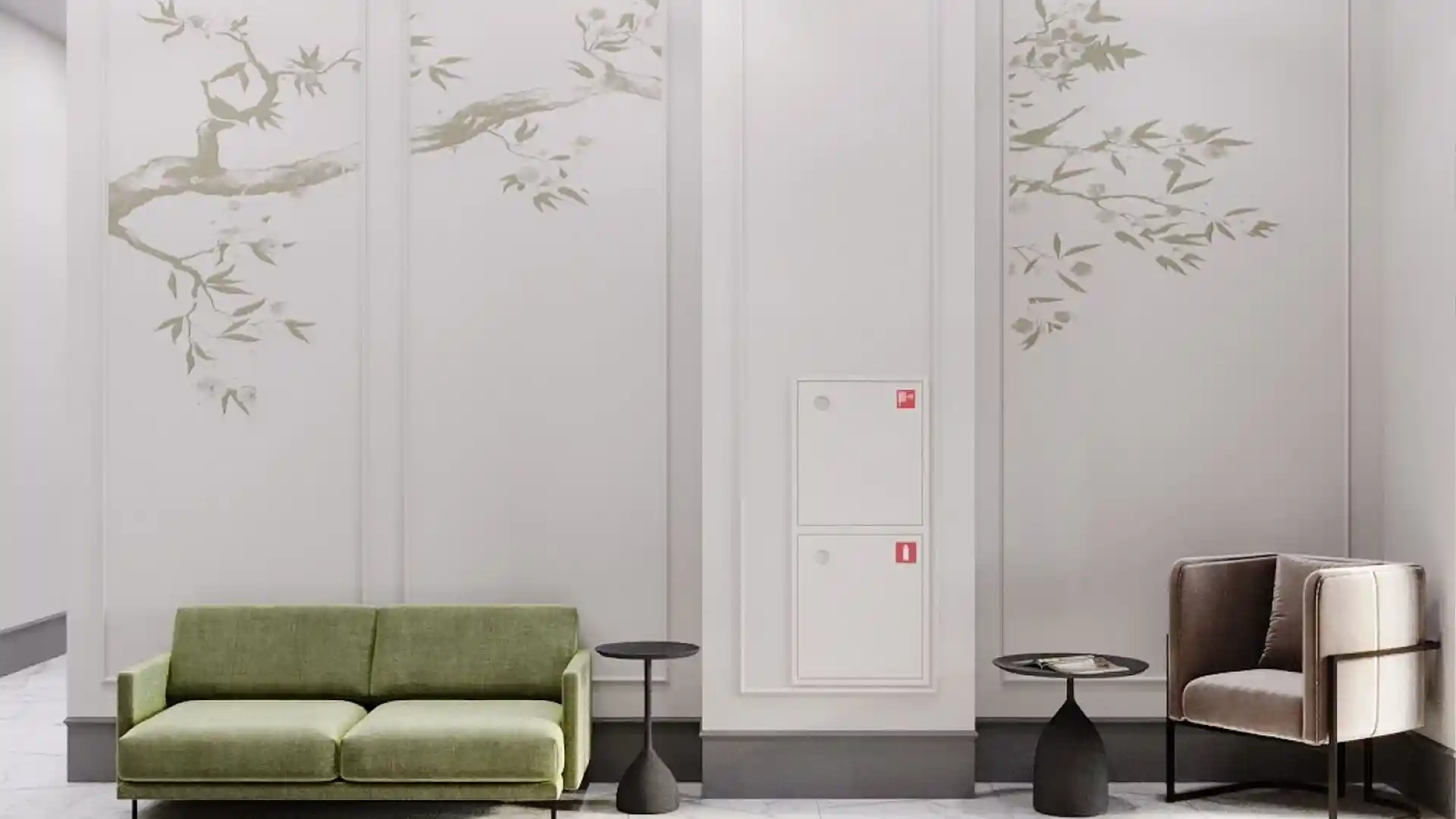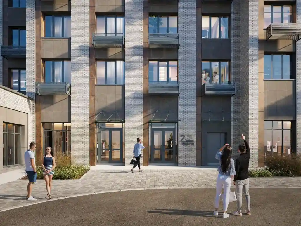 Фасады облицованы кирпичом и керамогранитными плитами в природных оттенках, что подчёркивает экологичность материалов. Дизайн лобби выполнен студией Soliform Interior: пространство включает зоны для отдыха и хранения, отделка выдержана в монохромной гамме с акцентами природных тонов. Остеклённые балконы обеспечивают оптимальное естественное освещение помещений и открывают виды на реку и лес.