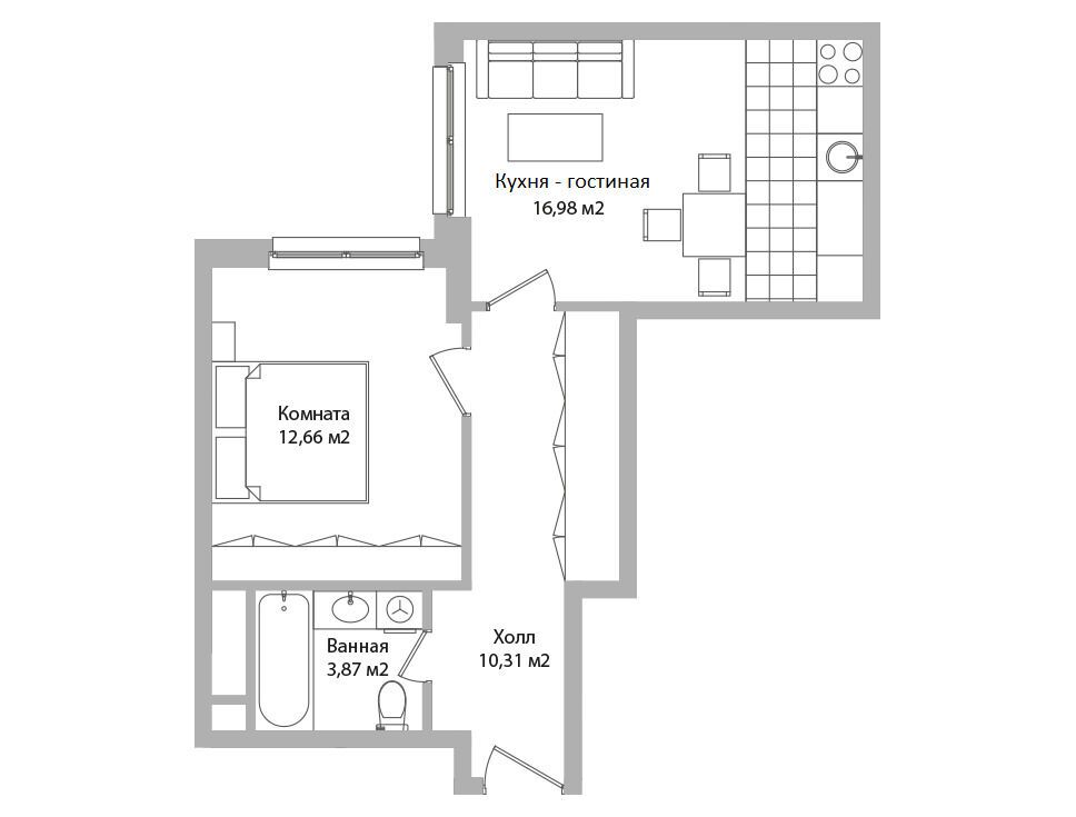2-комнатная, 44.70 м²