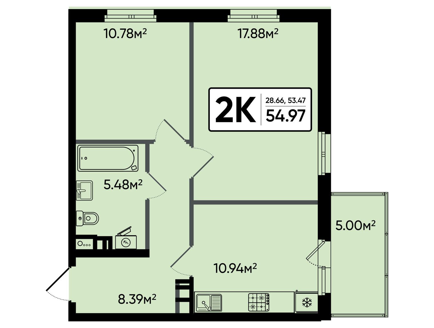 2-комн. квартира, 54.97 м²