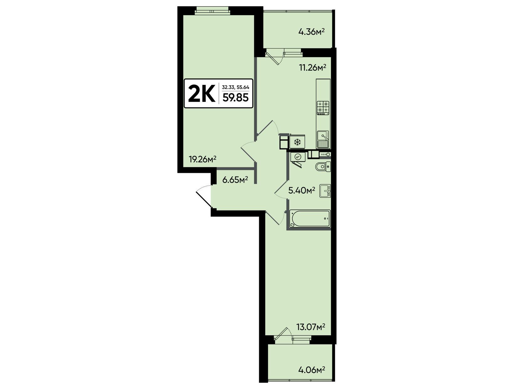 2-комн. квартира, 59.85 м²