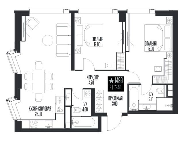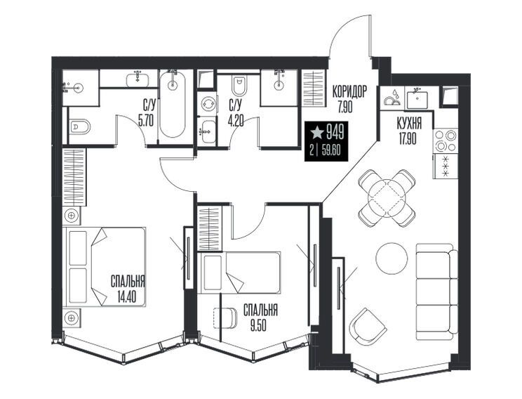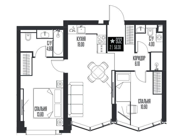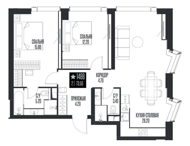 2-комнатная квартира, 55.70 м², 3 из 8 эт.