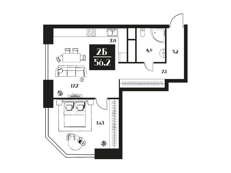 2-комнатная квартира, 54.90 м², 3 из 16 эт.