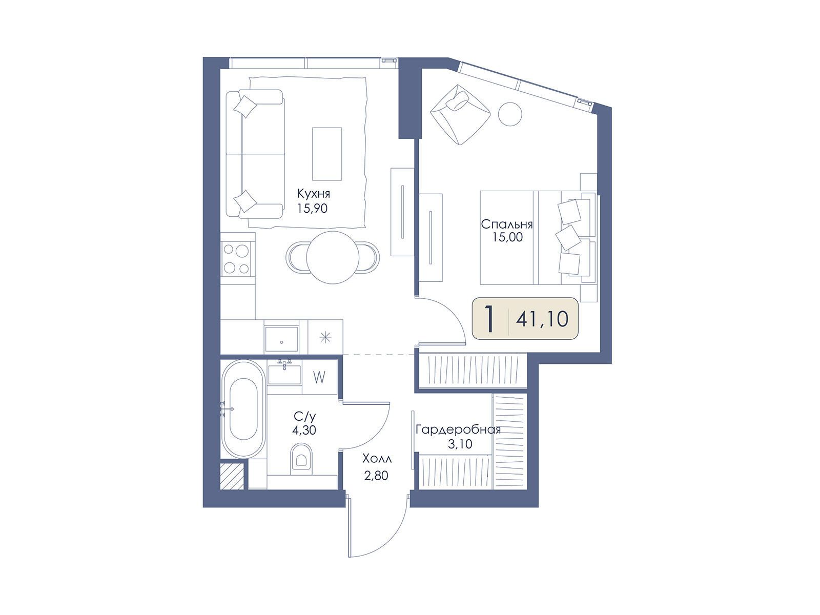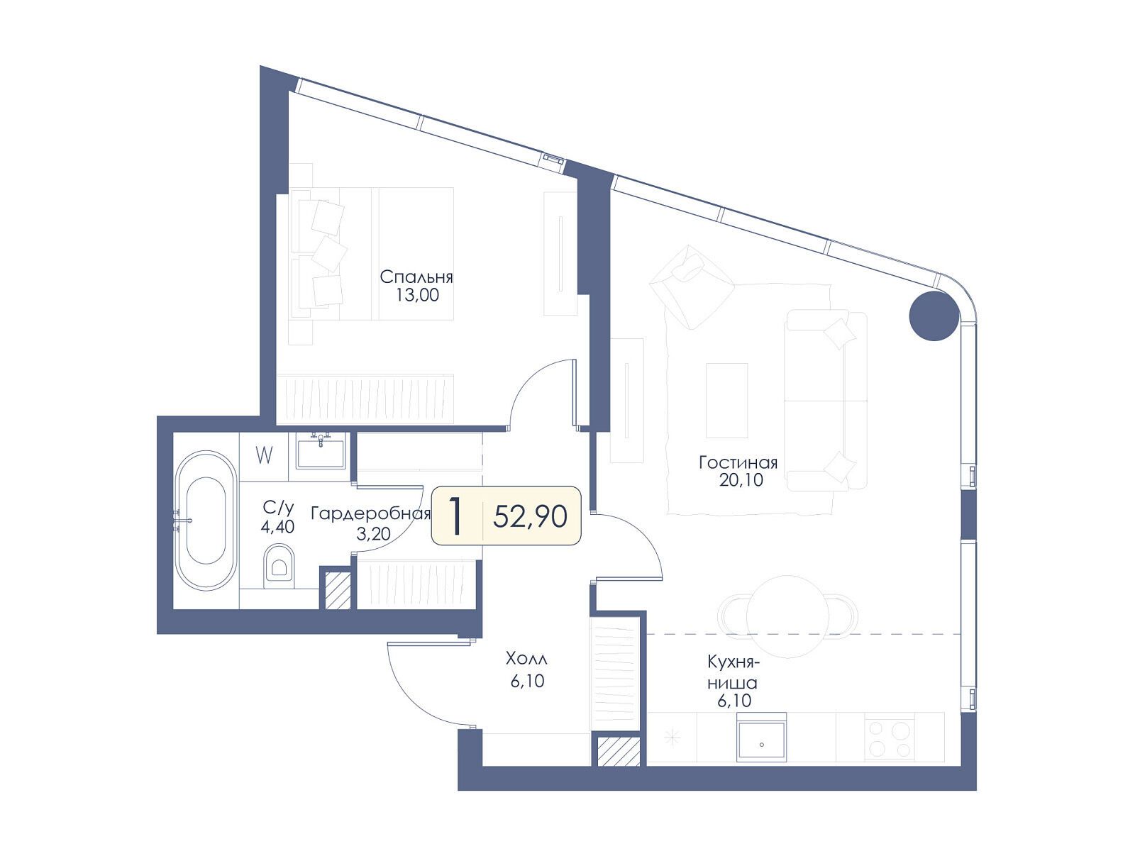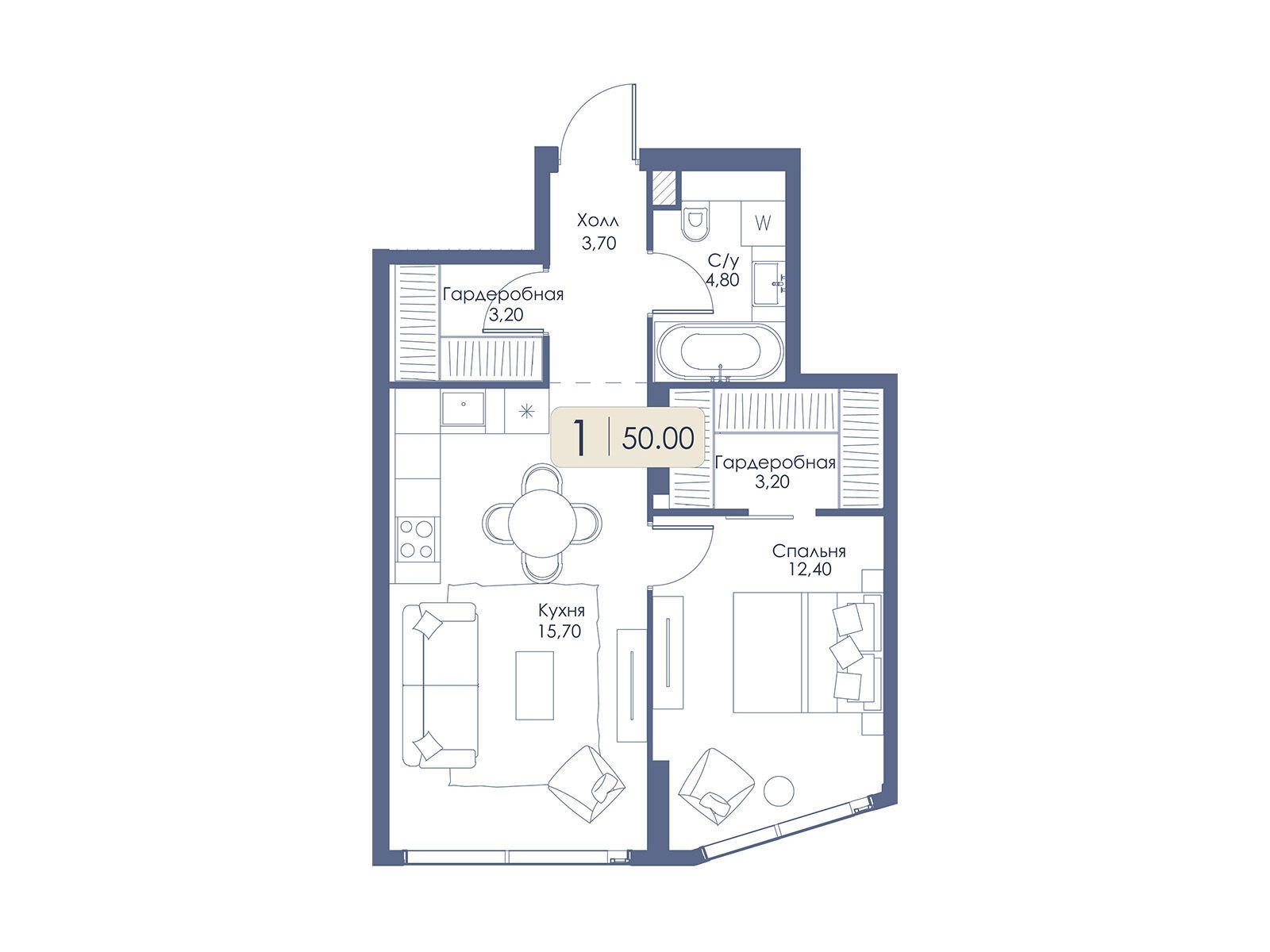 1-комнатная квартира, 50.00 м², 31 из 34 эт.
