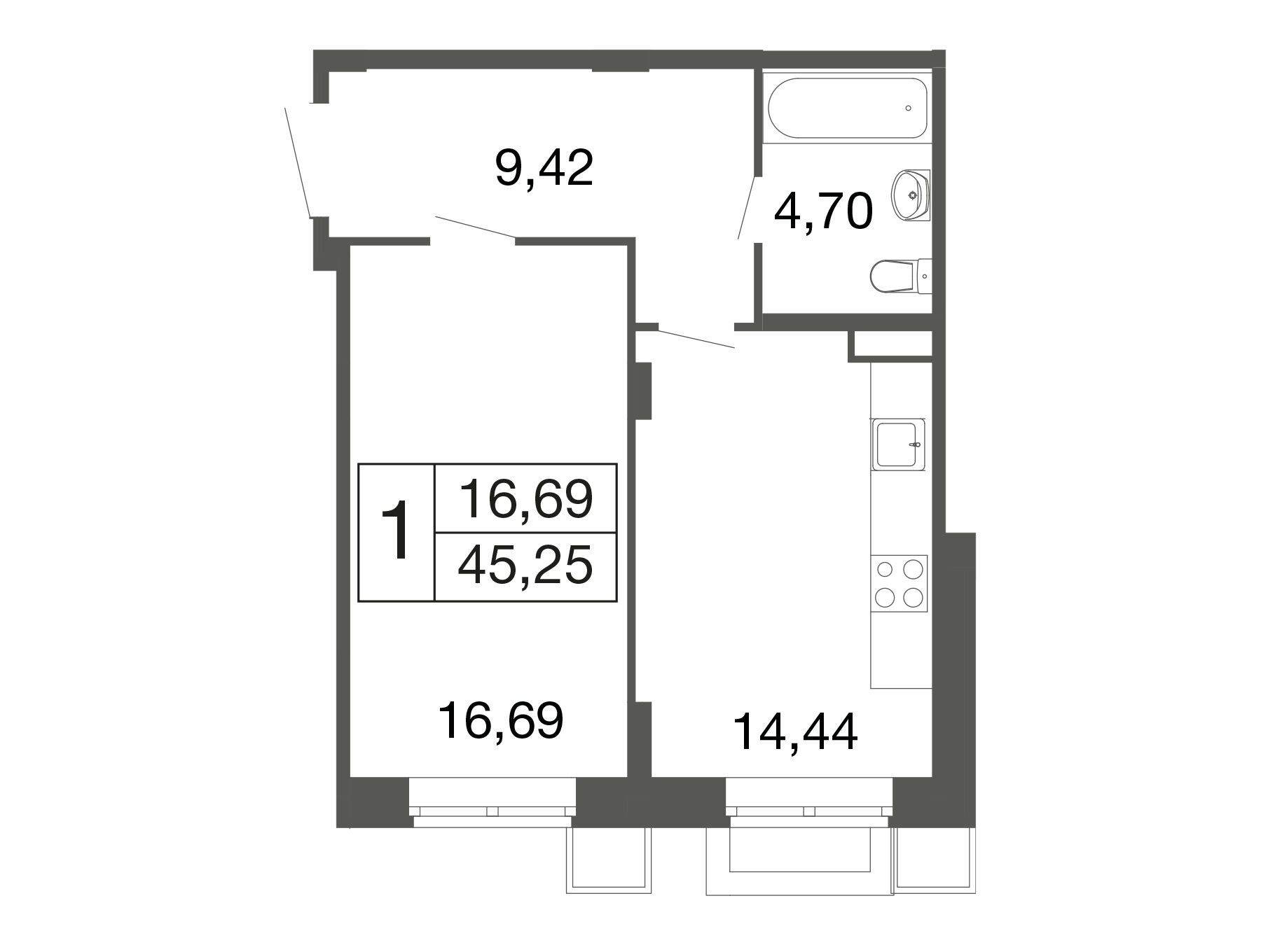 1-комн. квартира, 45.25 м²