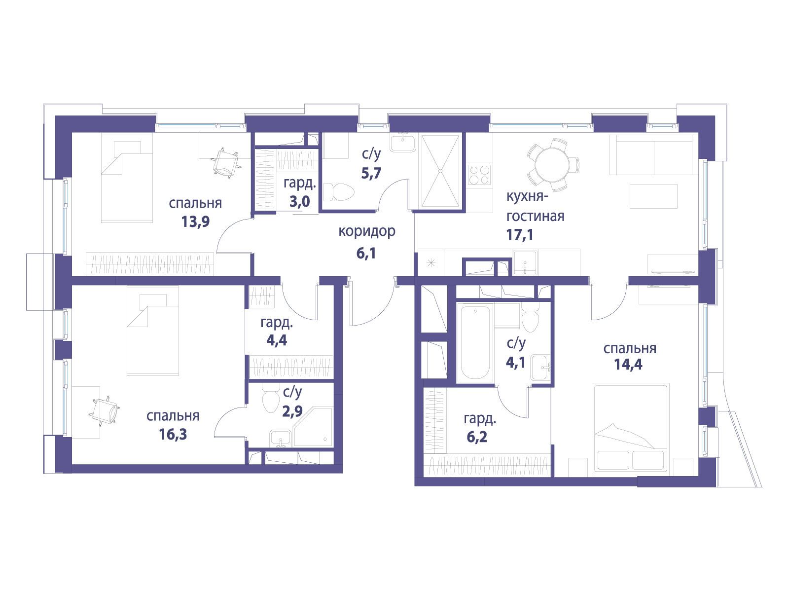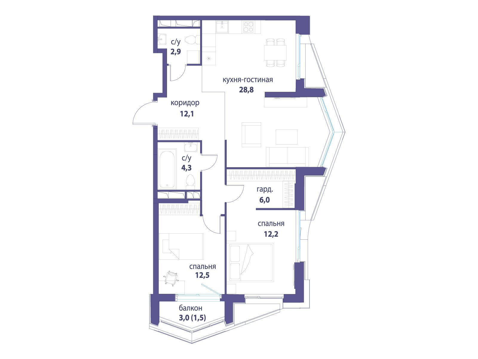3-комнатная квартира, 94.10 м², 12 из 21 эт.