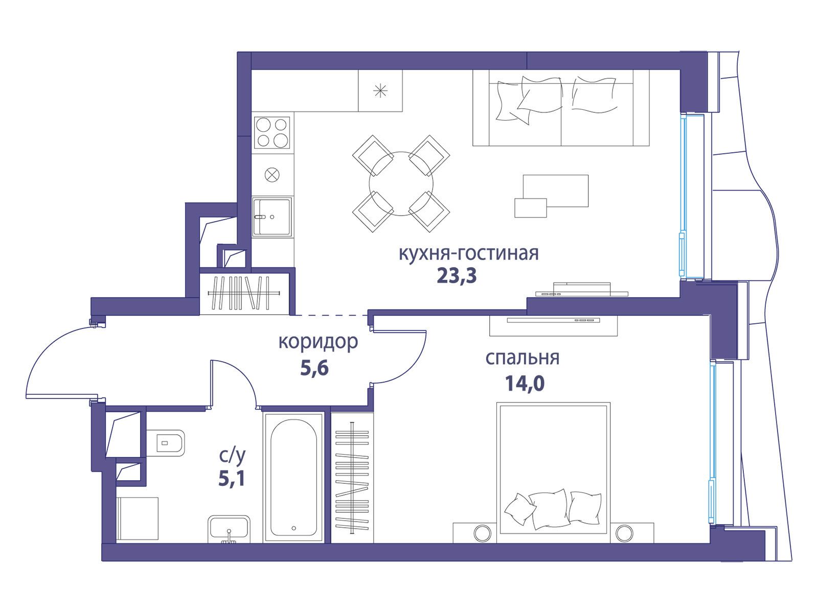 1-комнатная, 55.70 м²