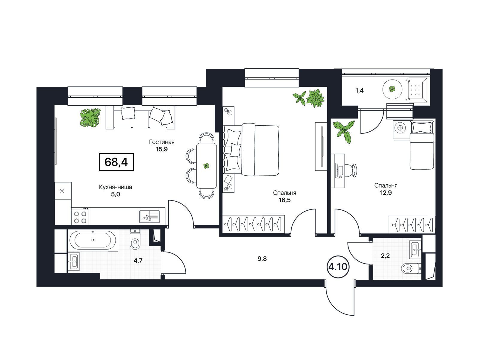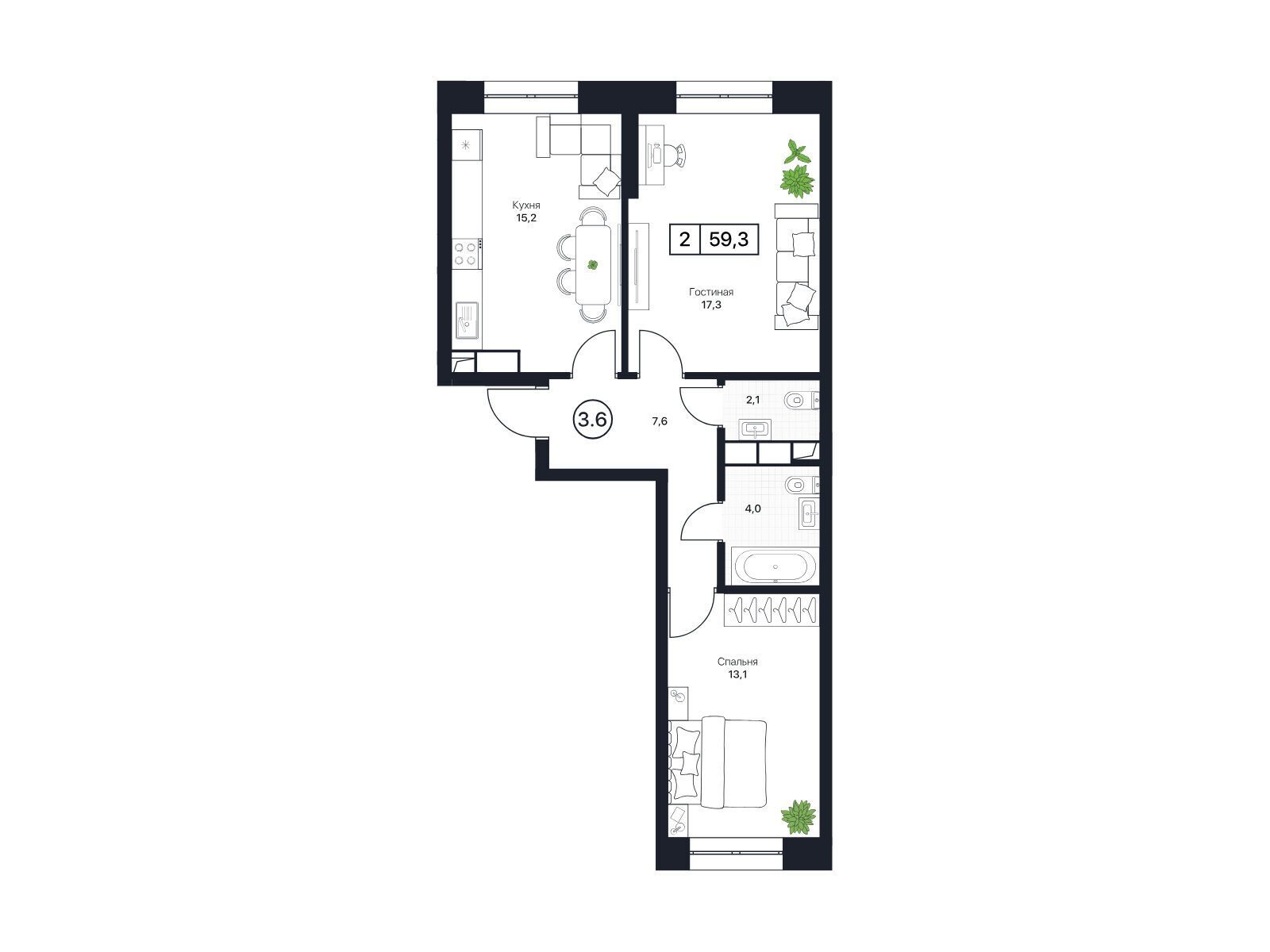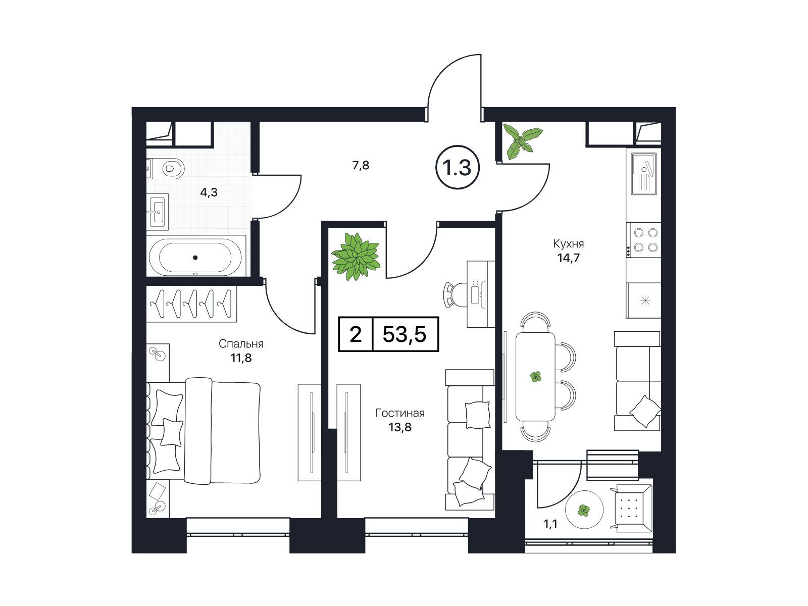 2-комнатная квартира, 53.50 м², 6 из 13 эт.
