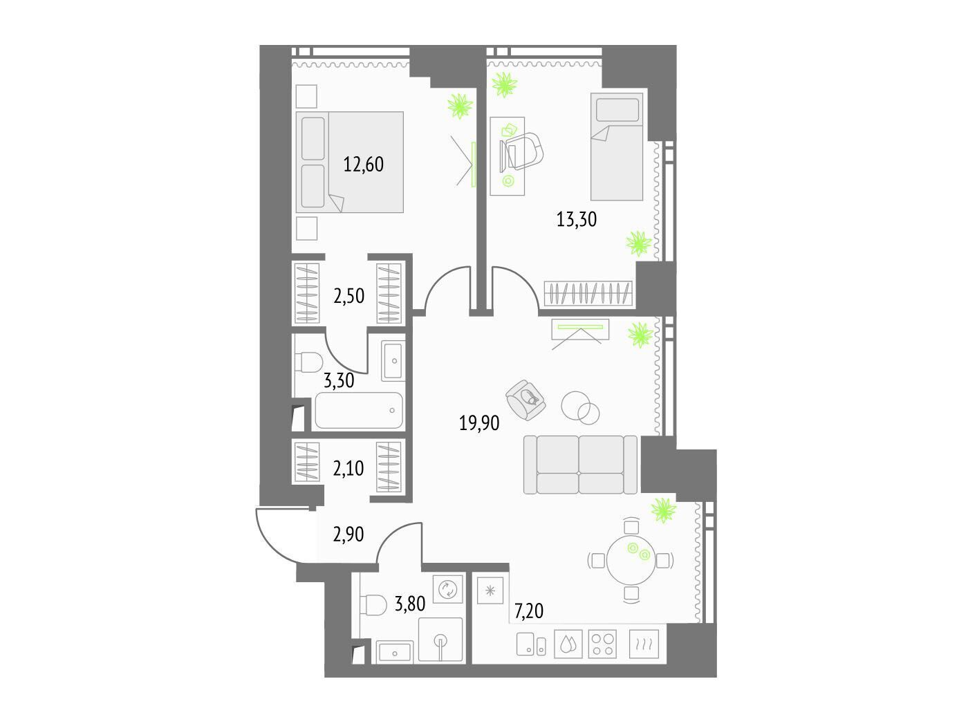 2-комнатная квартира, 63.10 м², 5 из 54 эт.