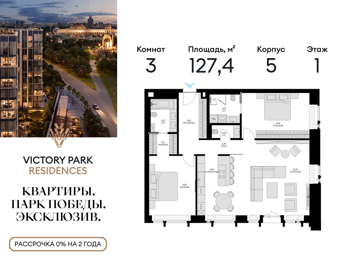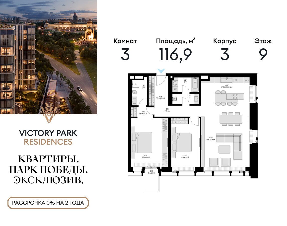 3-комнатная квартира, 117.10 м², 9 из 13 эт.