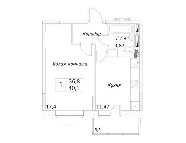 1-комнатная, 44.00 м²