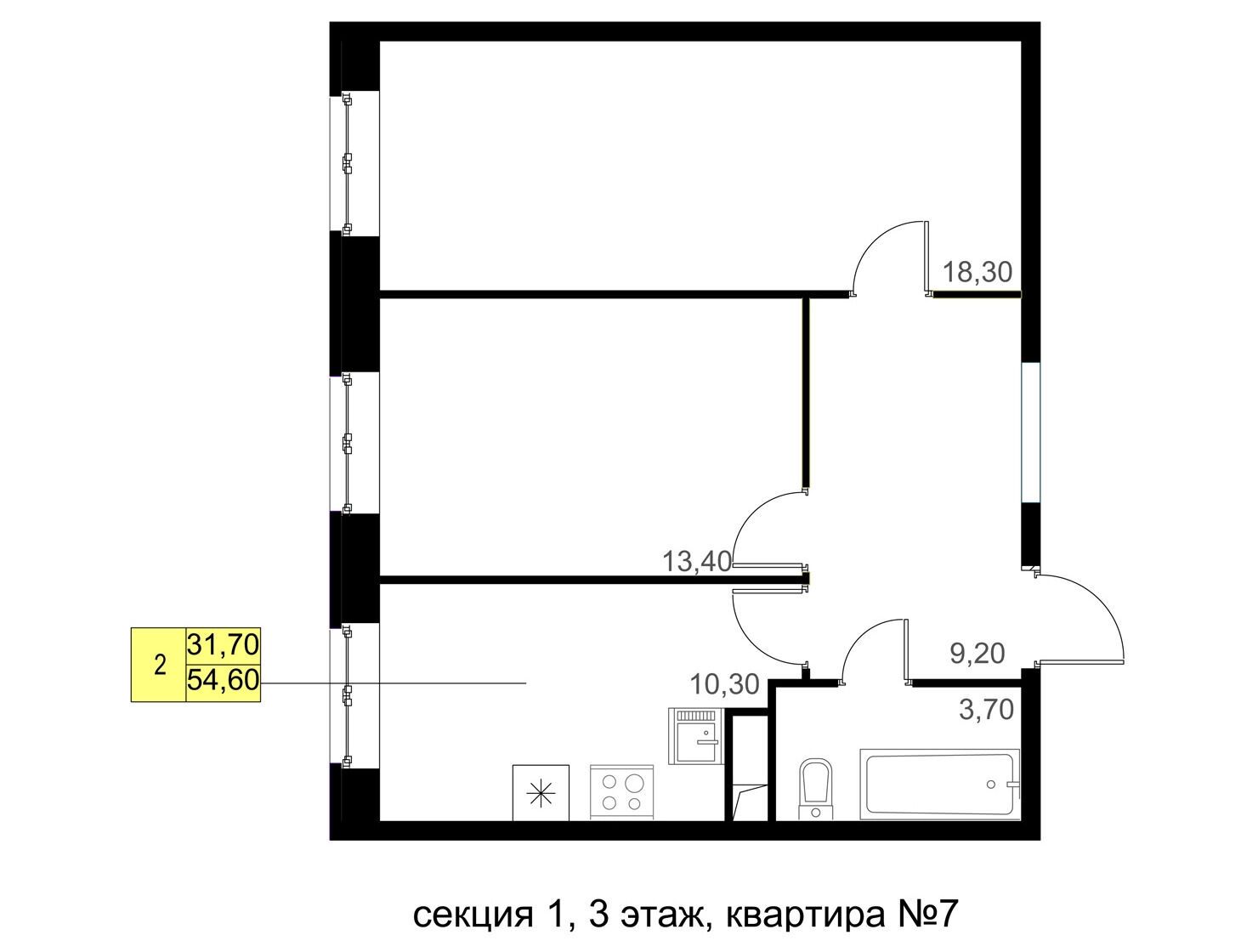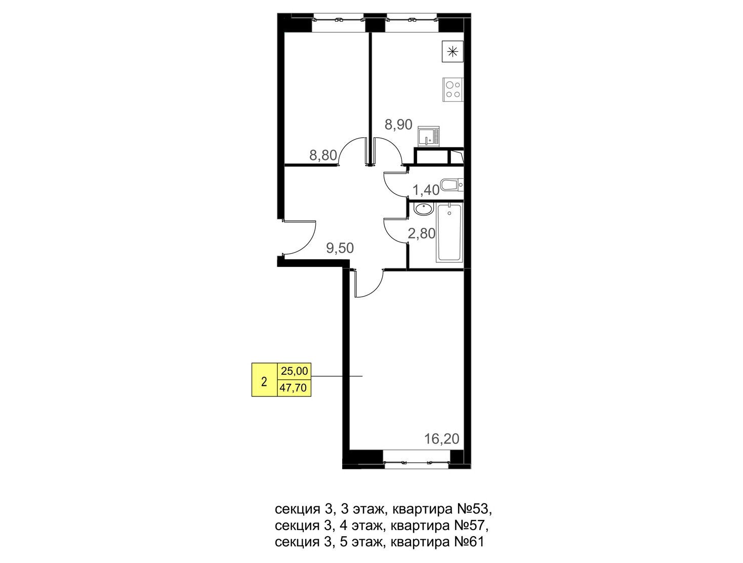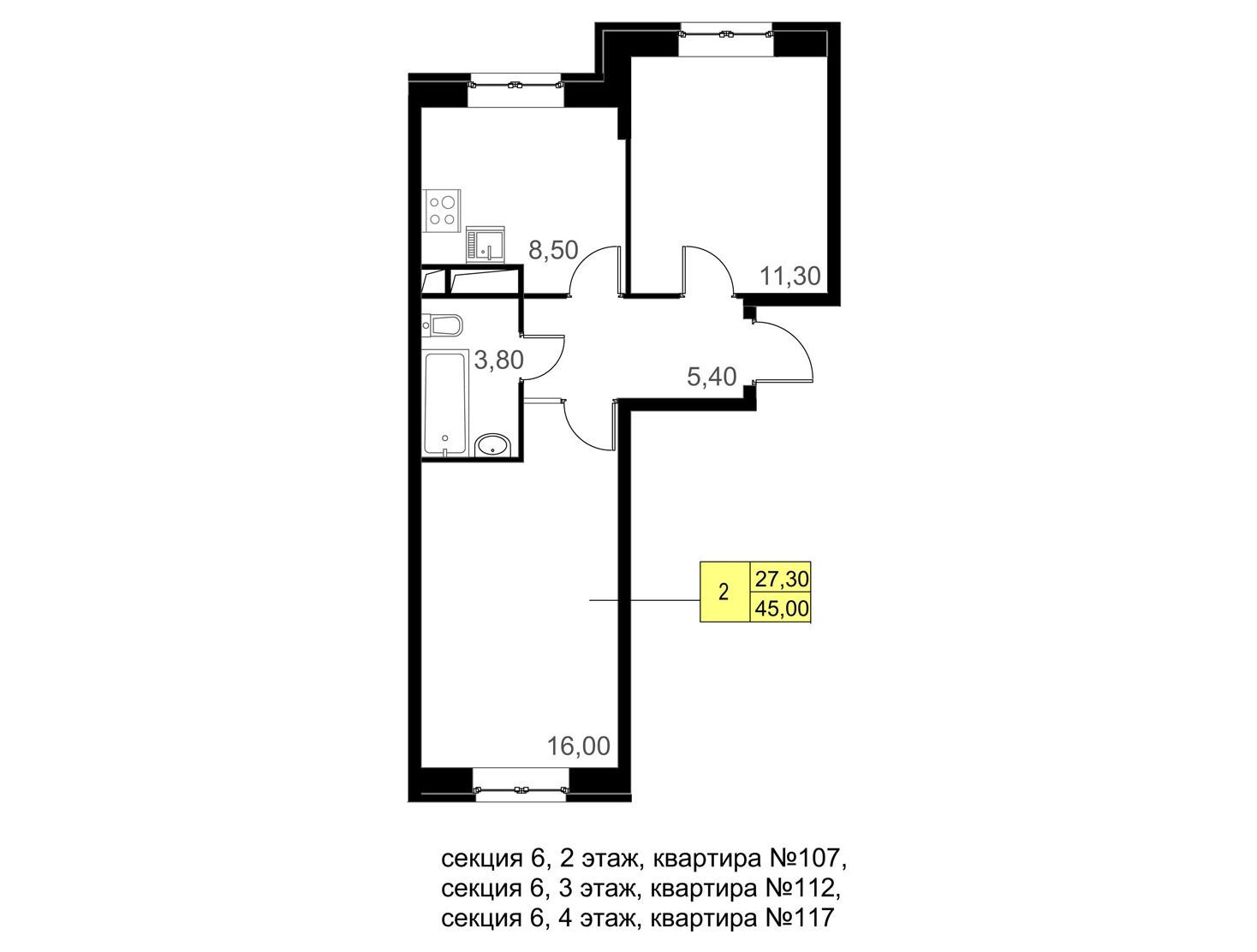 2-комнатная, 44.90 м²