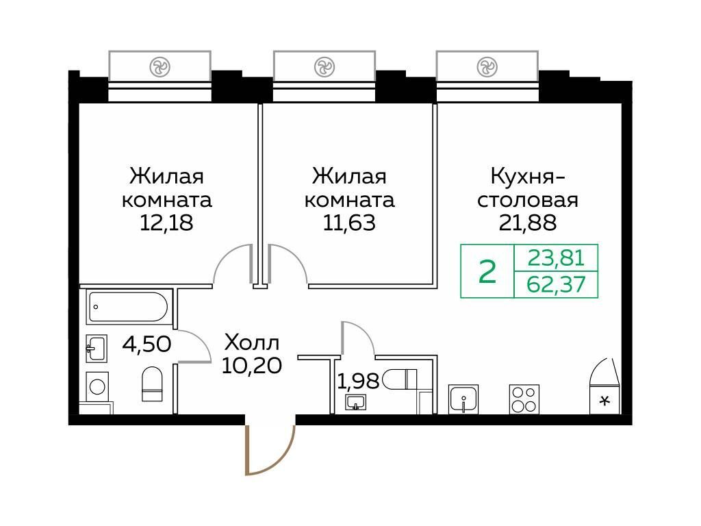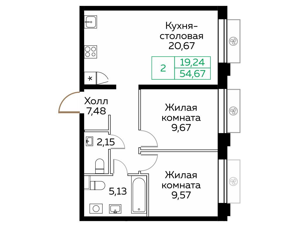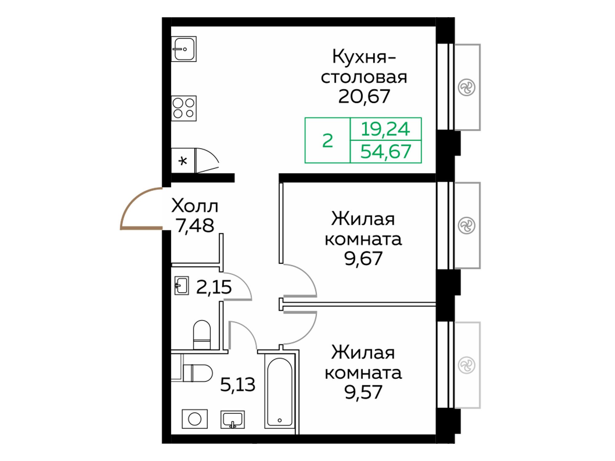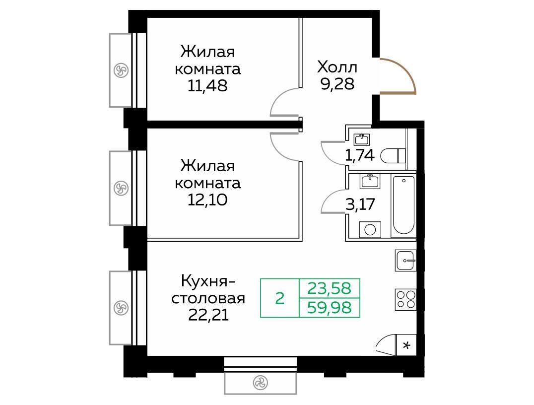 2-комнатная квартира, 57.70 м², 22 из 25 эт.