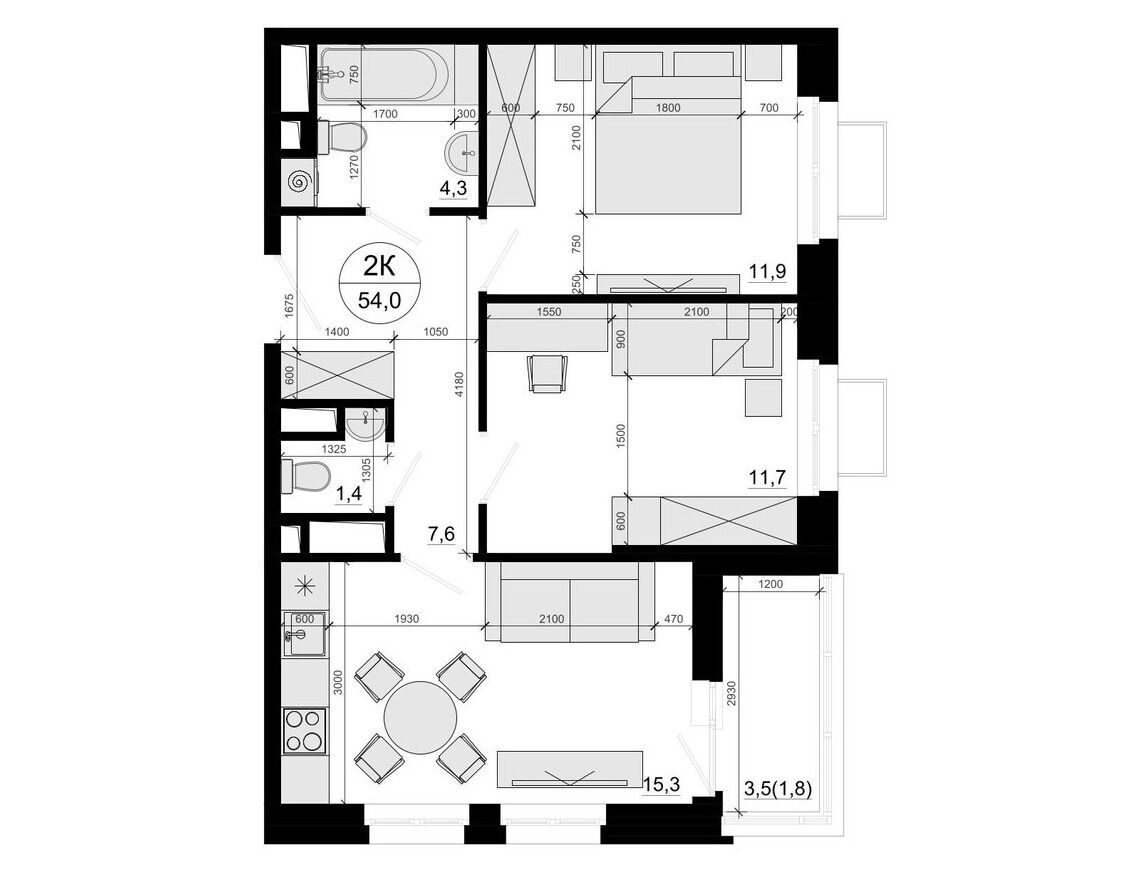 2-комнатная, 54.00 м²