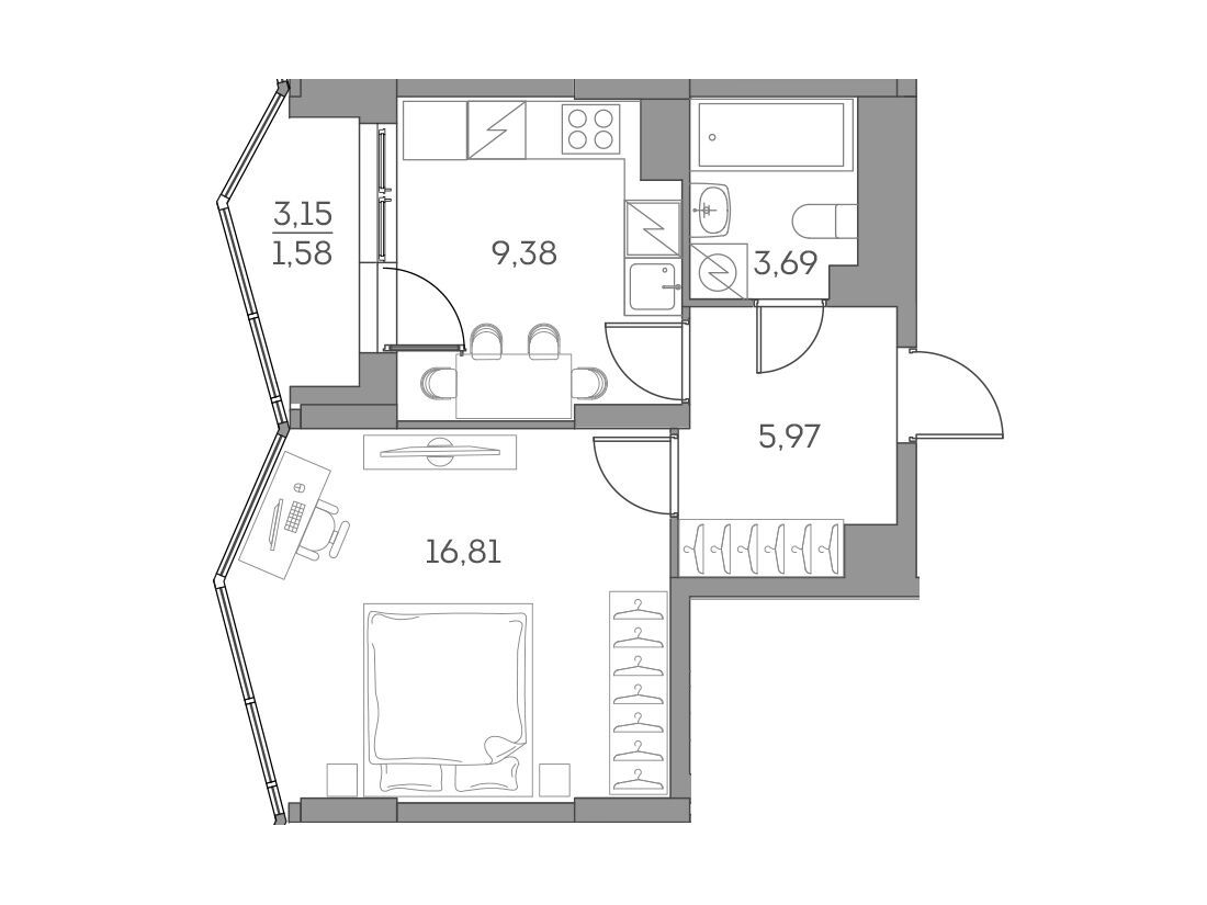 1-комнатная, 32.55 м²