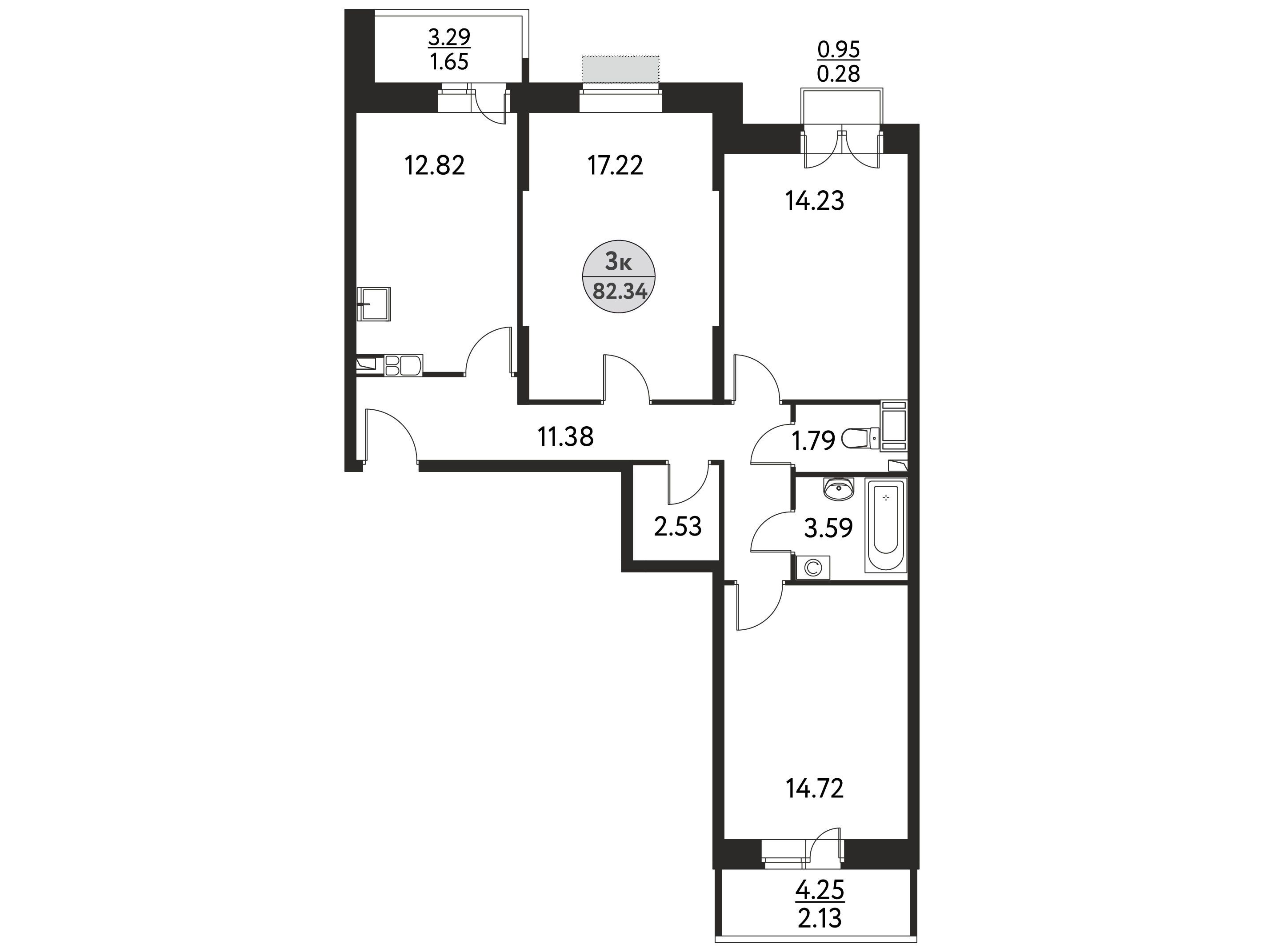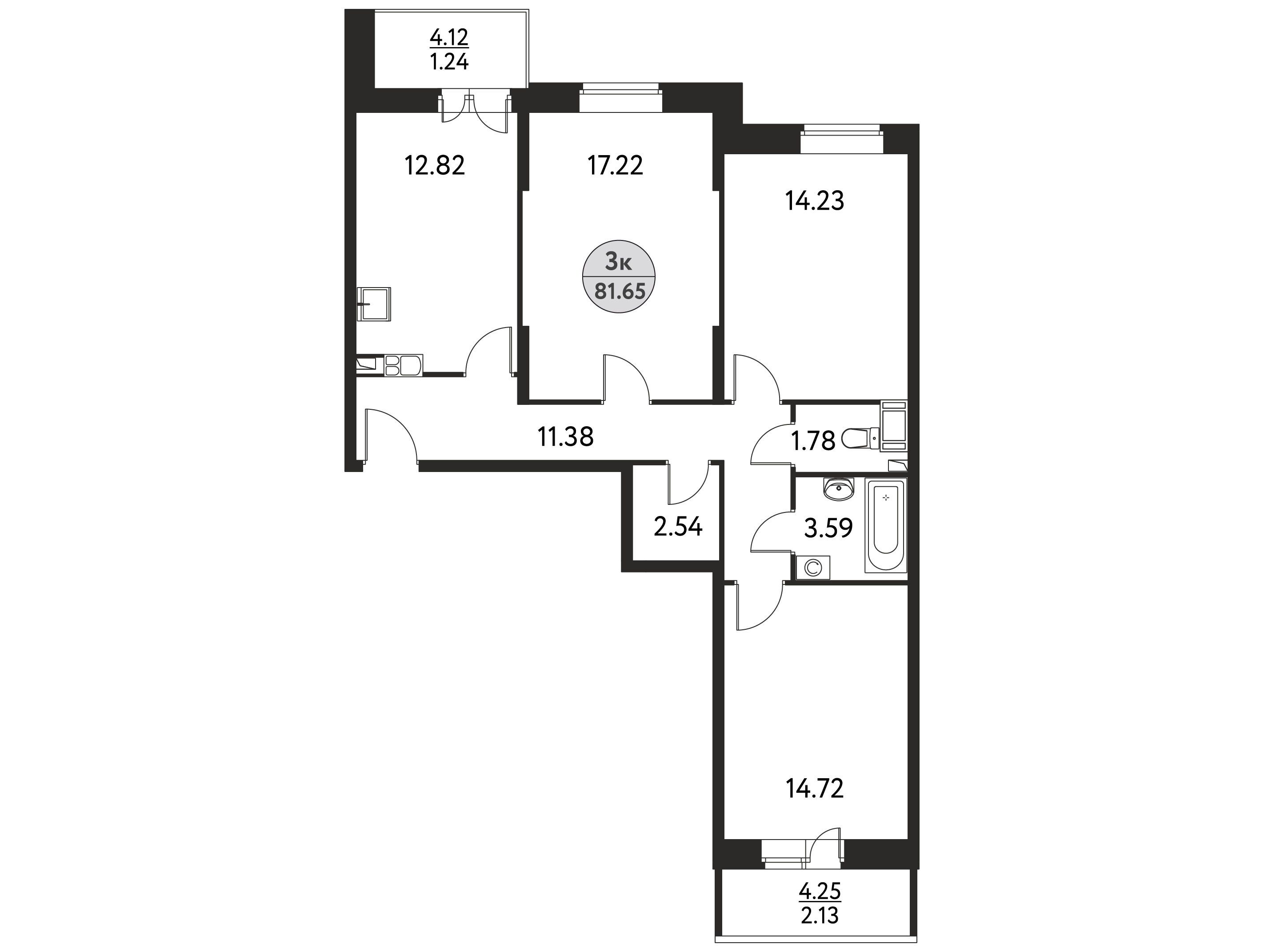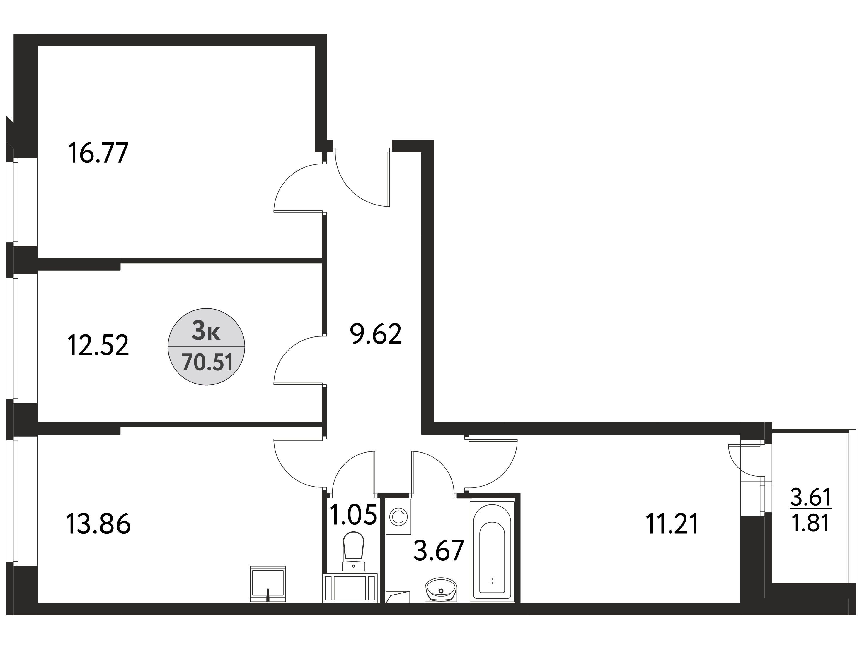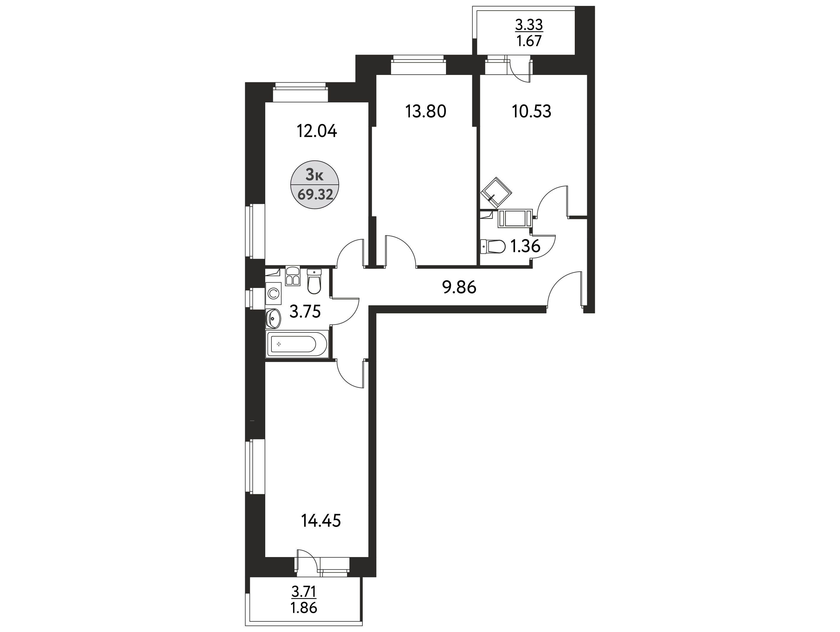 3-комнатная, 68.91 м²