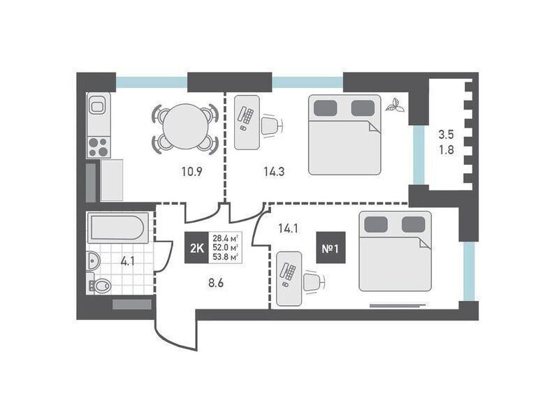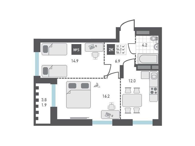 2-комнатная, 56.10 м²