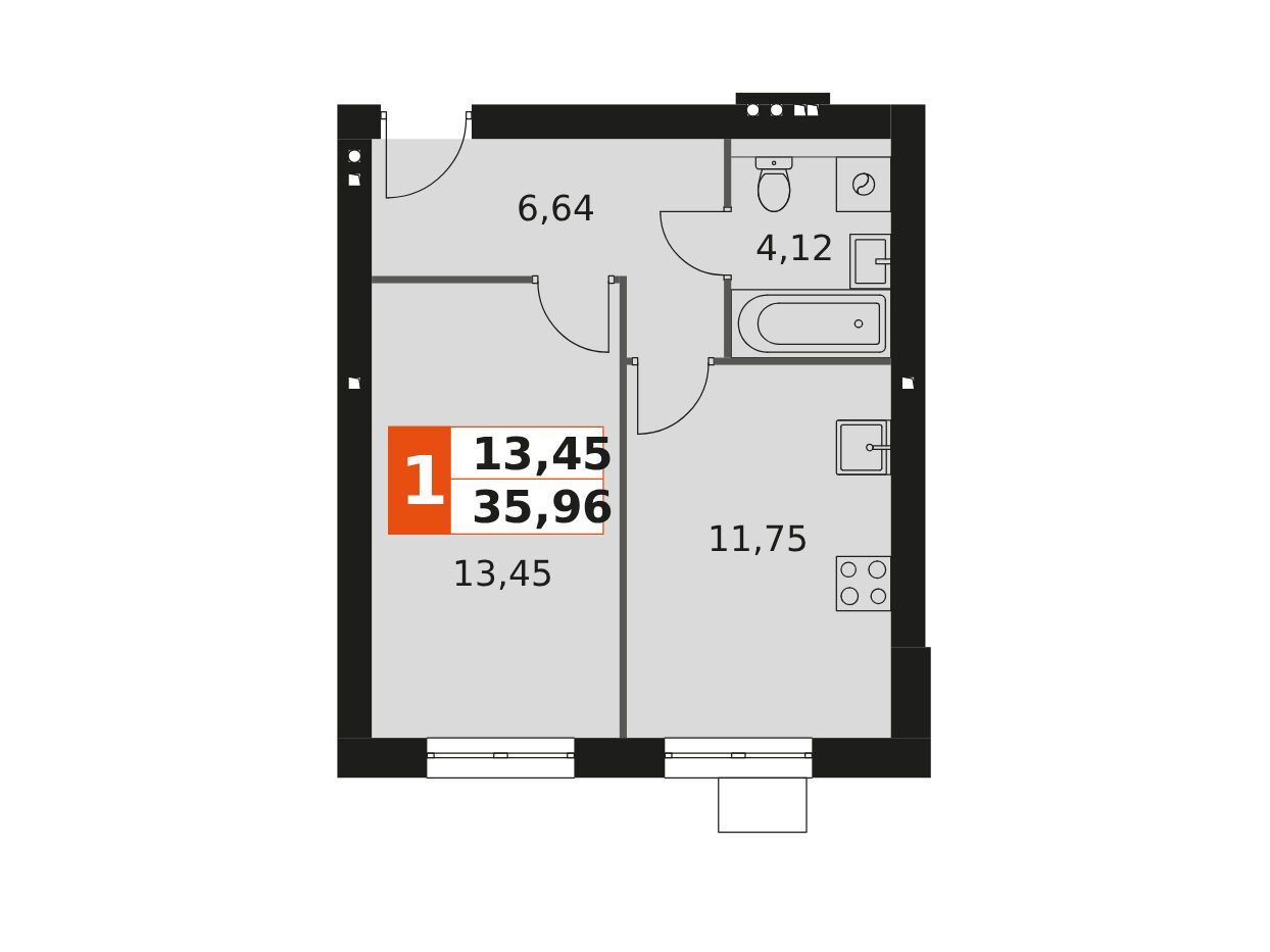 1-комн. квартира, 35.96 м²