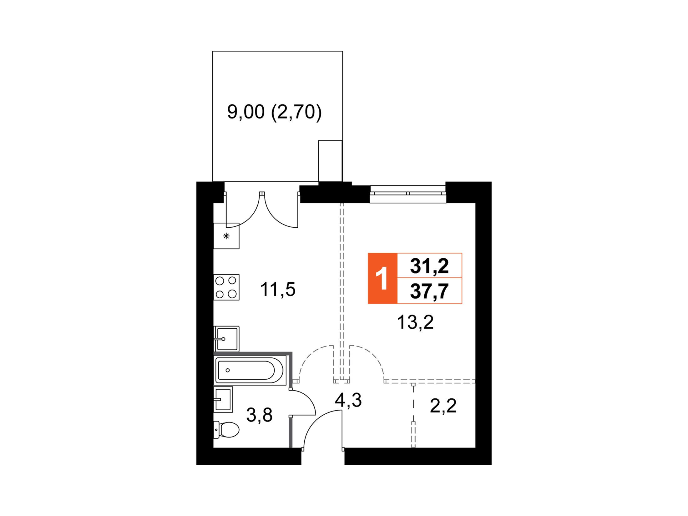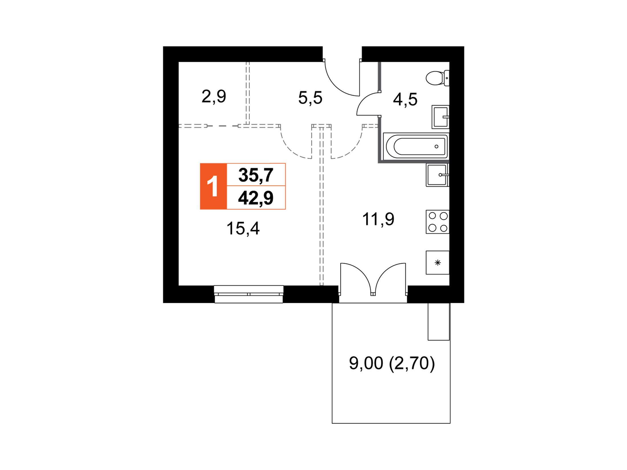 1-комнатная, 42.20 м²