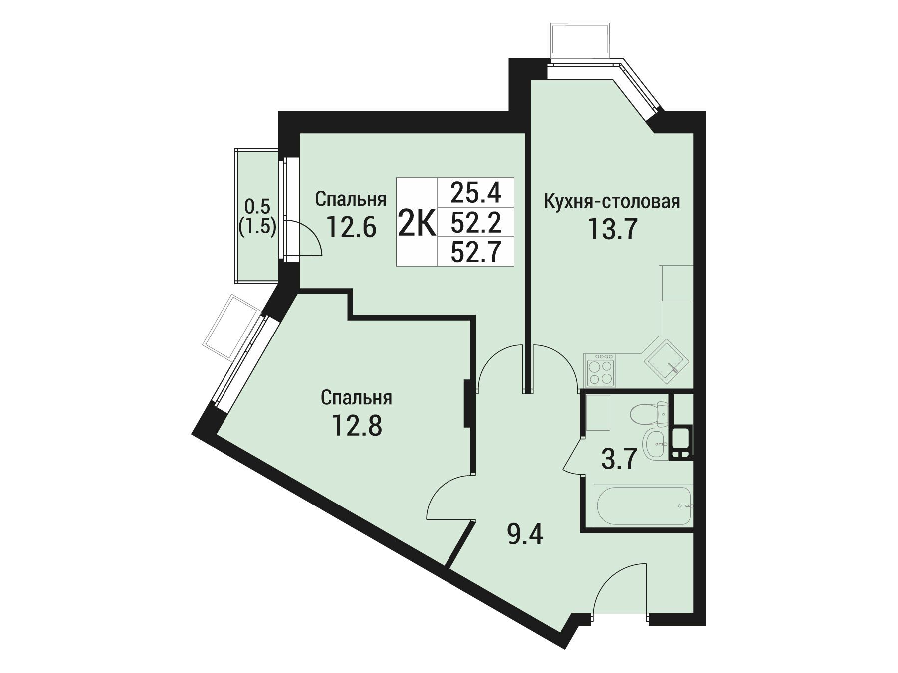 2-комнатная квартира, 52.40 м², 5 из 5 эт.