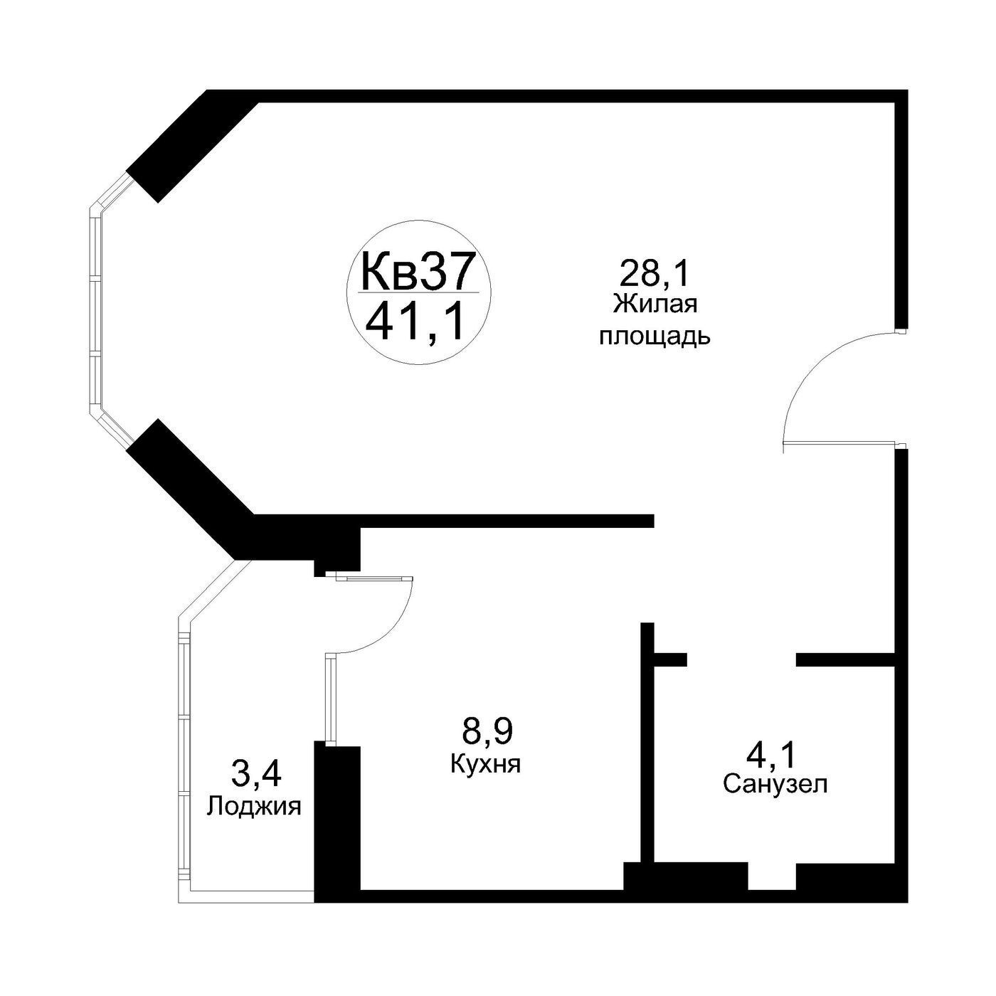 1-комнатная, 44.30 м²