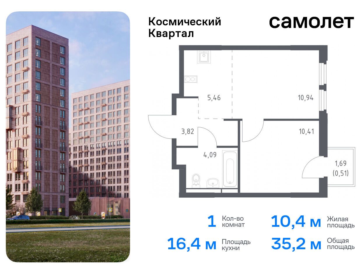 1-комн. квартира, 35.23 м²