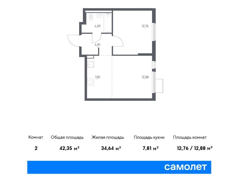 1-комнатная, 34.58 м²