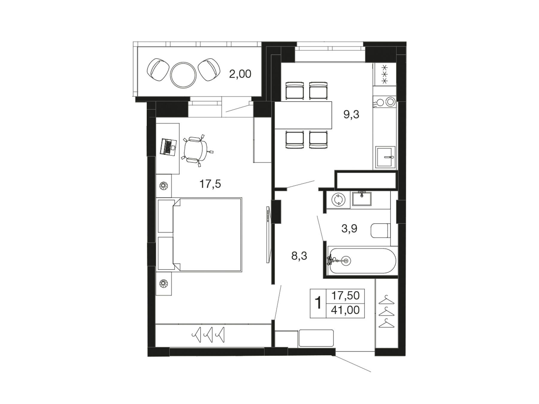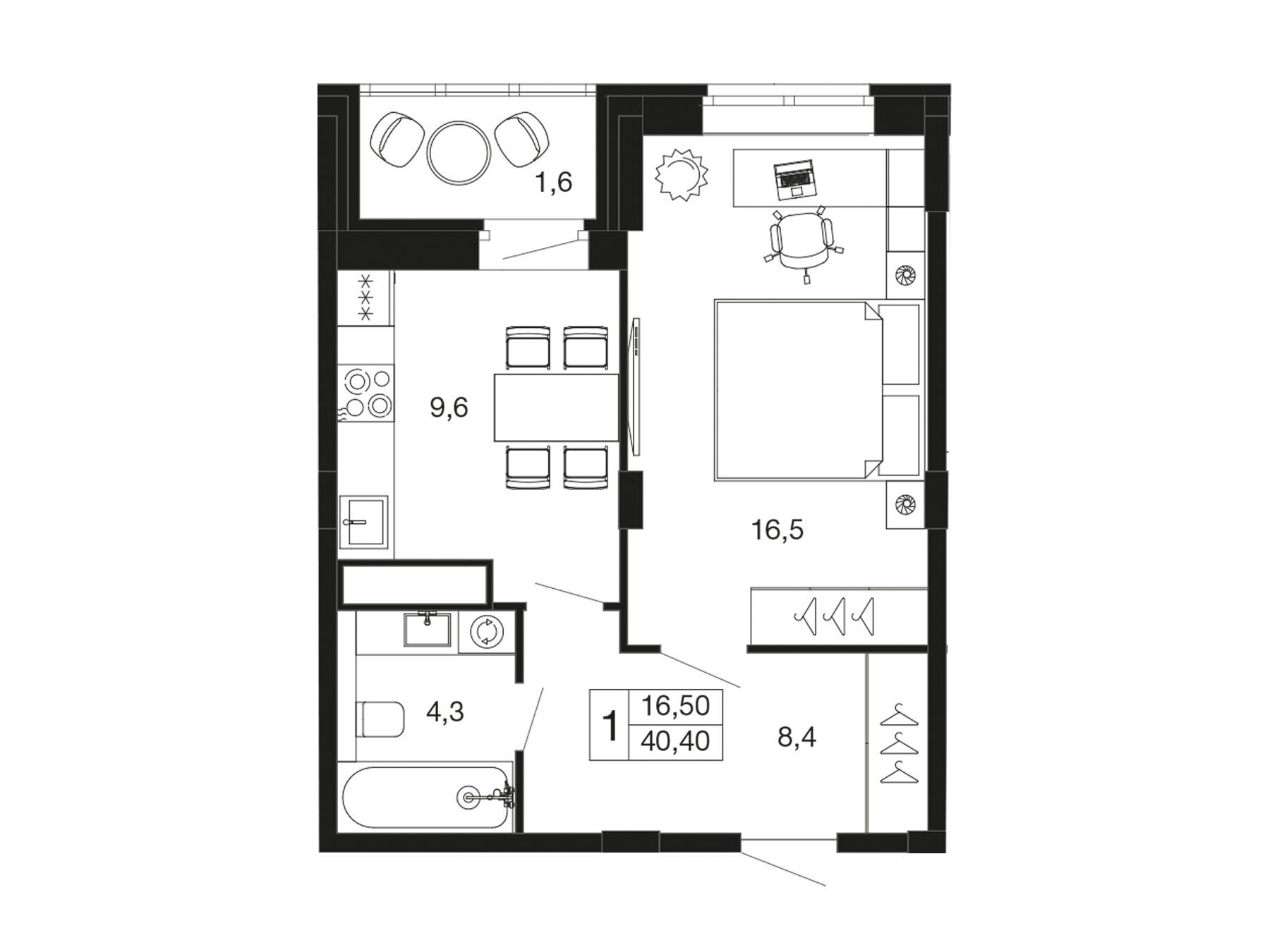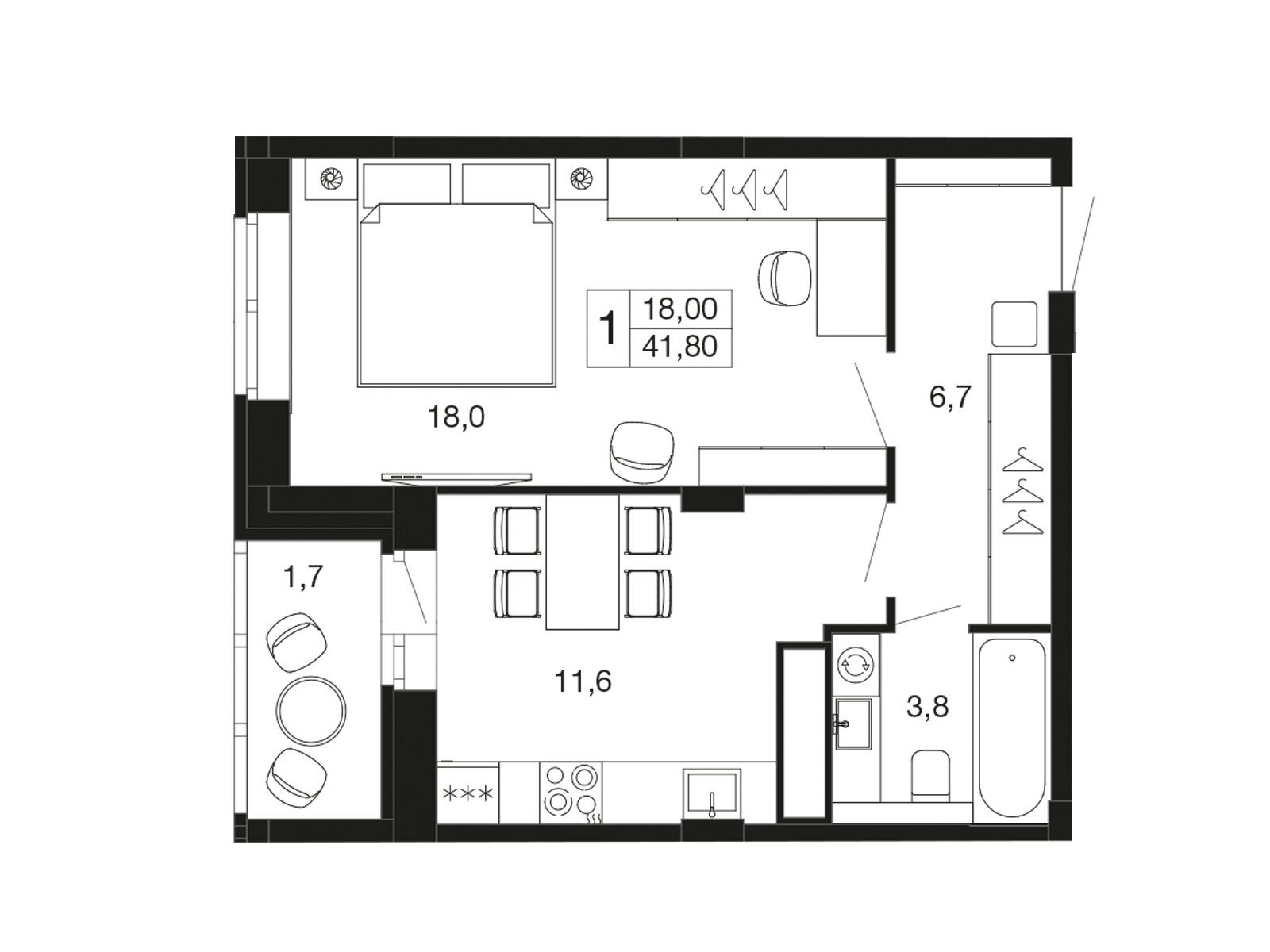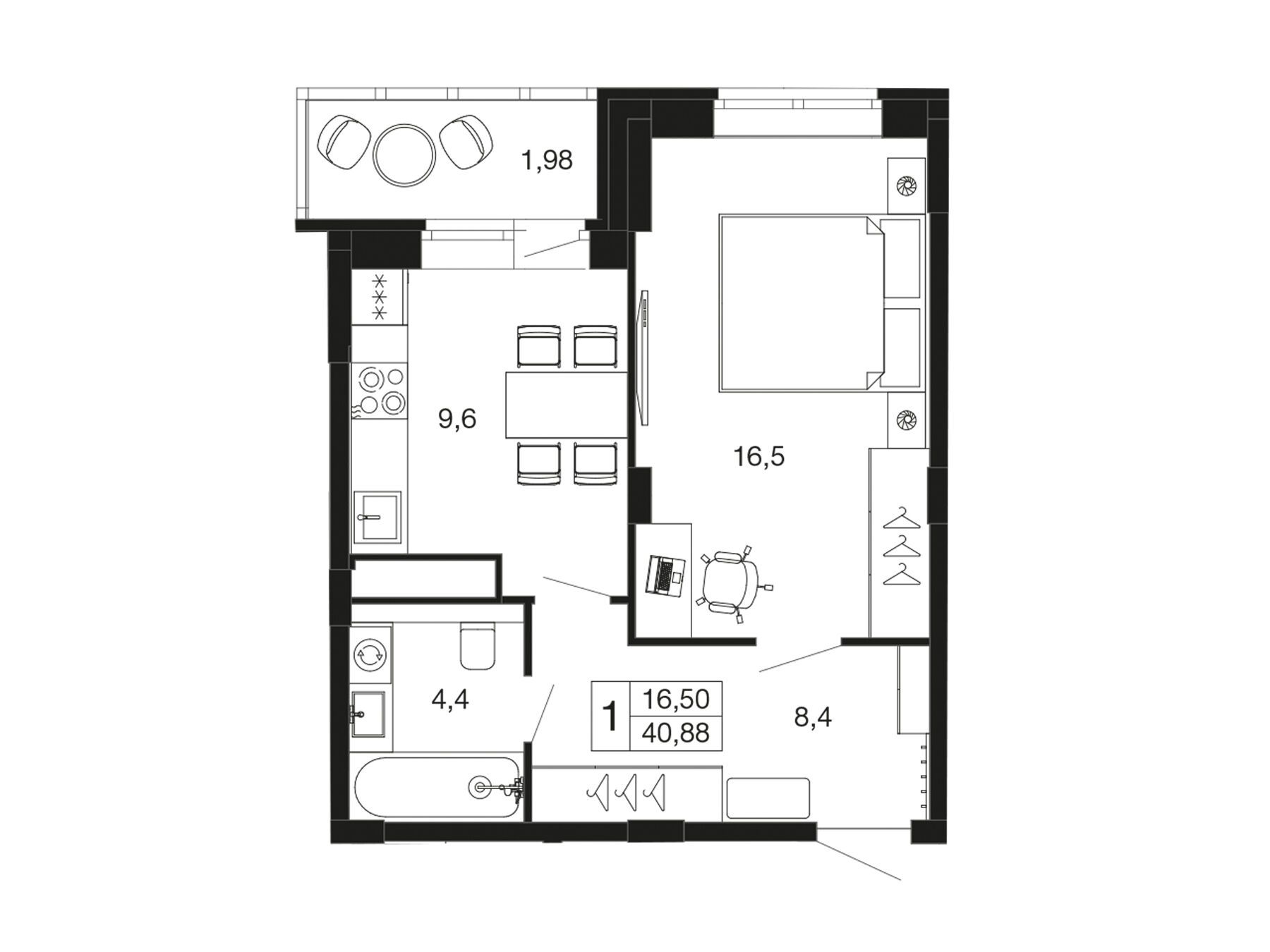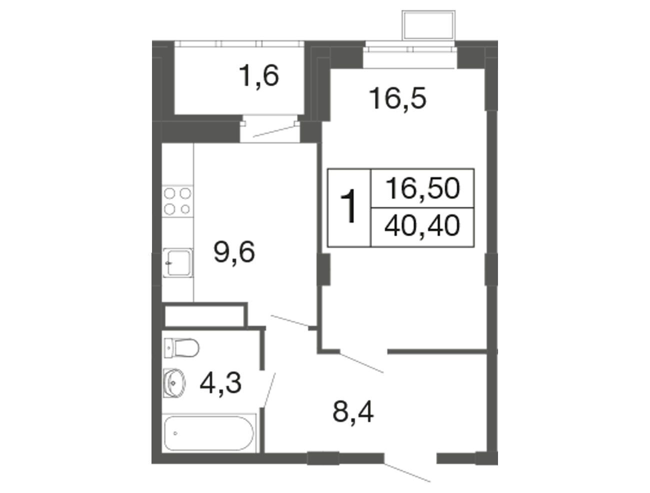 1-комнатная, 40.90 м²
