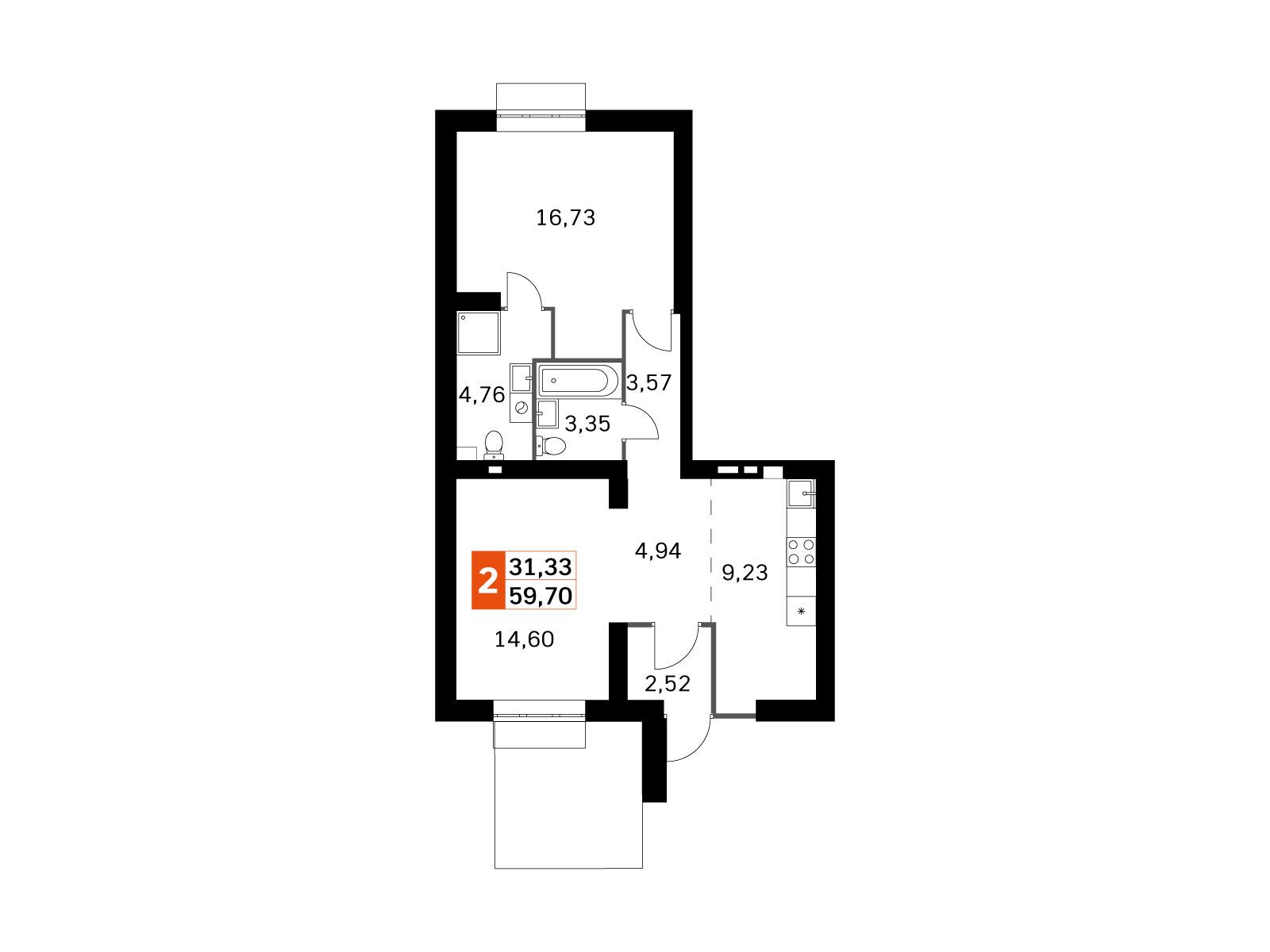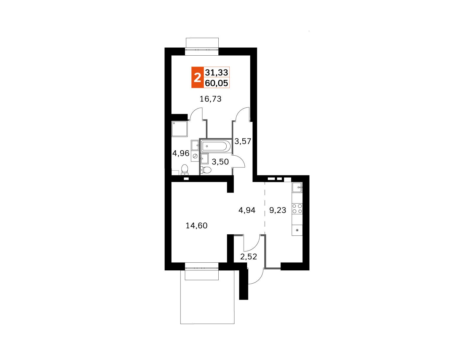 2-комнатная квартира, 57.17 м², 2 из 4 эт.