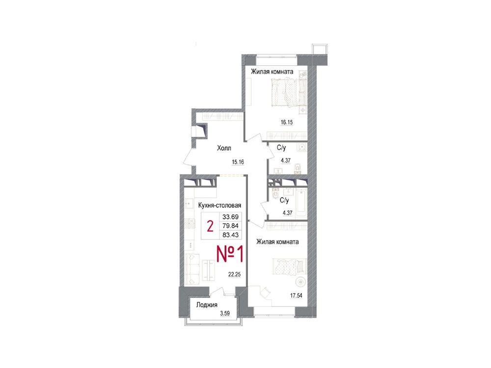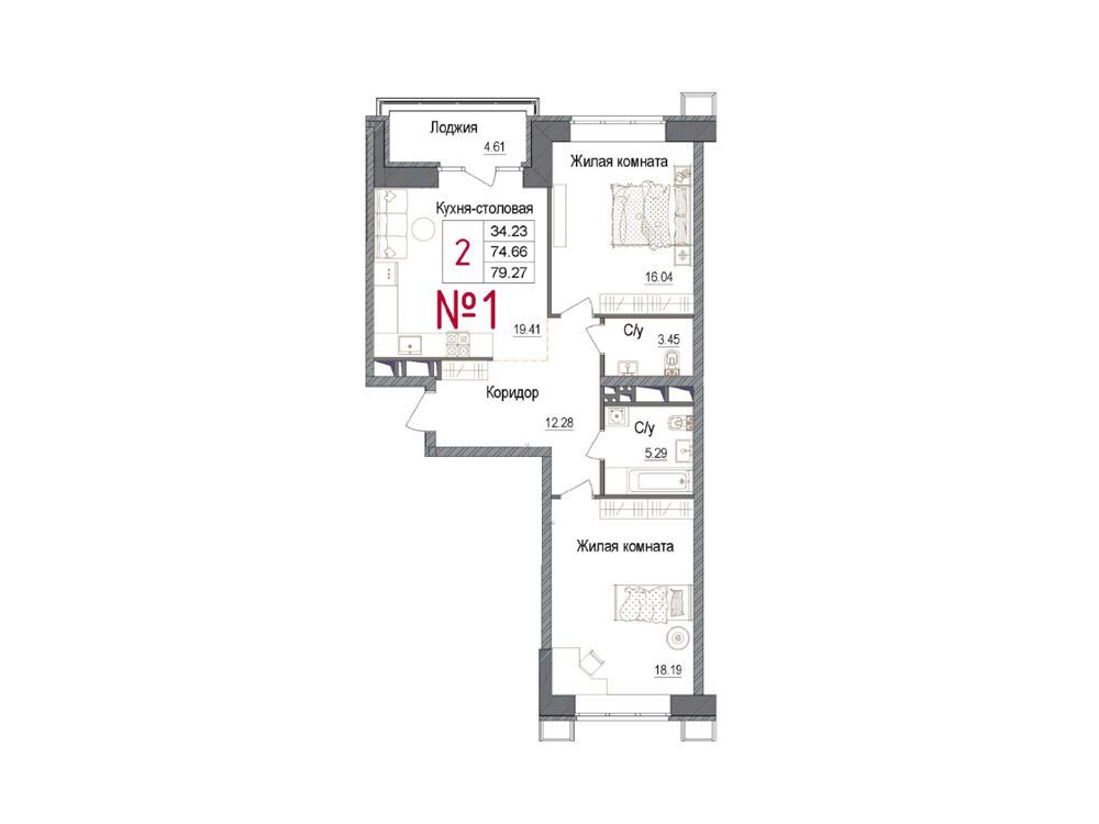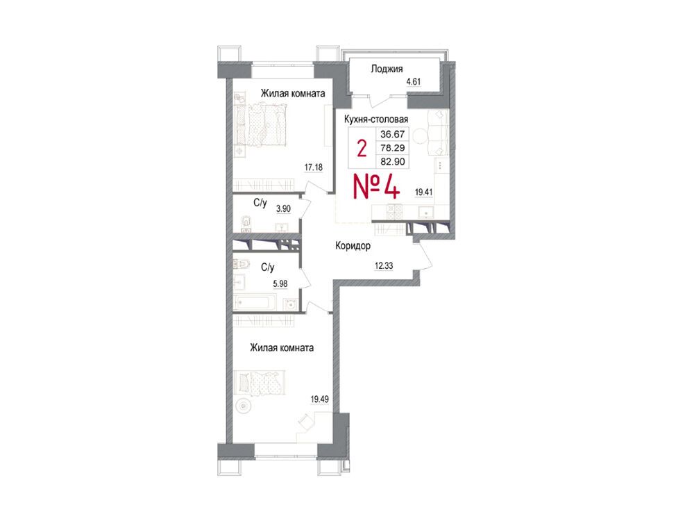 2-комнатная квартира, 68.10 м², 4 из 7 эт.