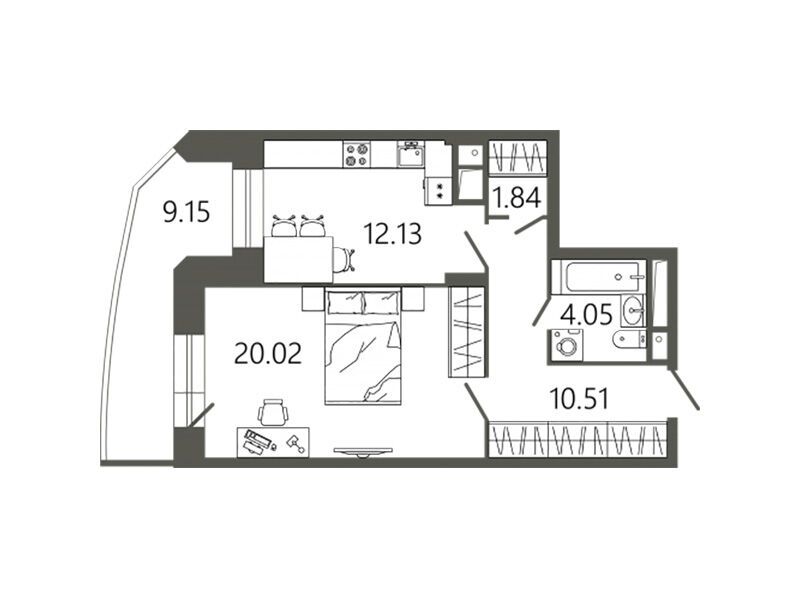 1-комнатная, 51.30 м²