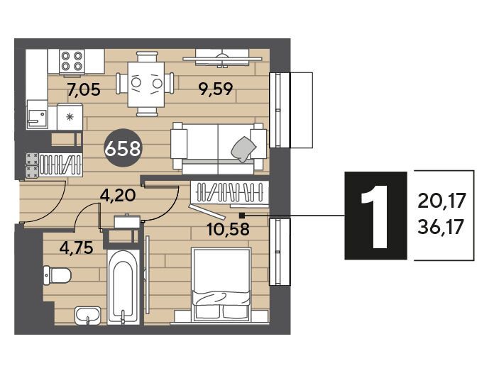 1-комнатная, 38.49 м²