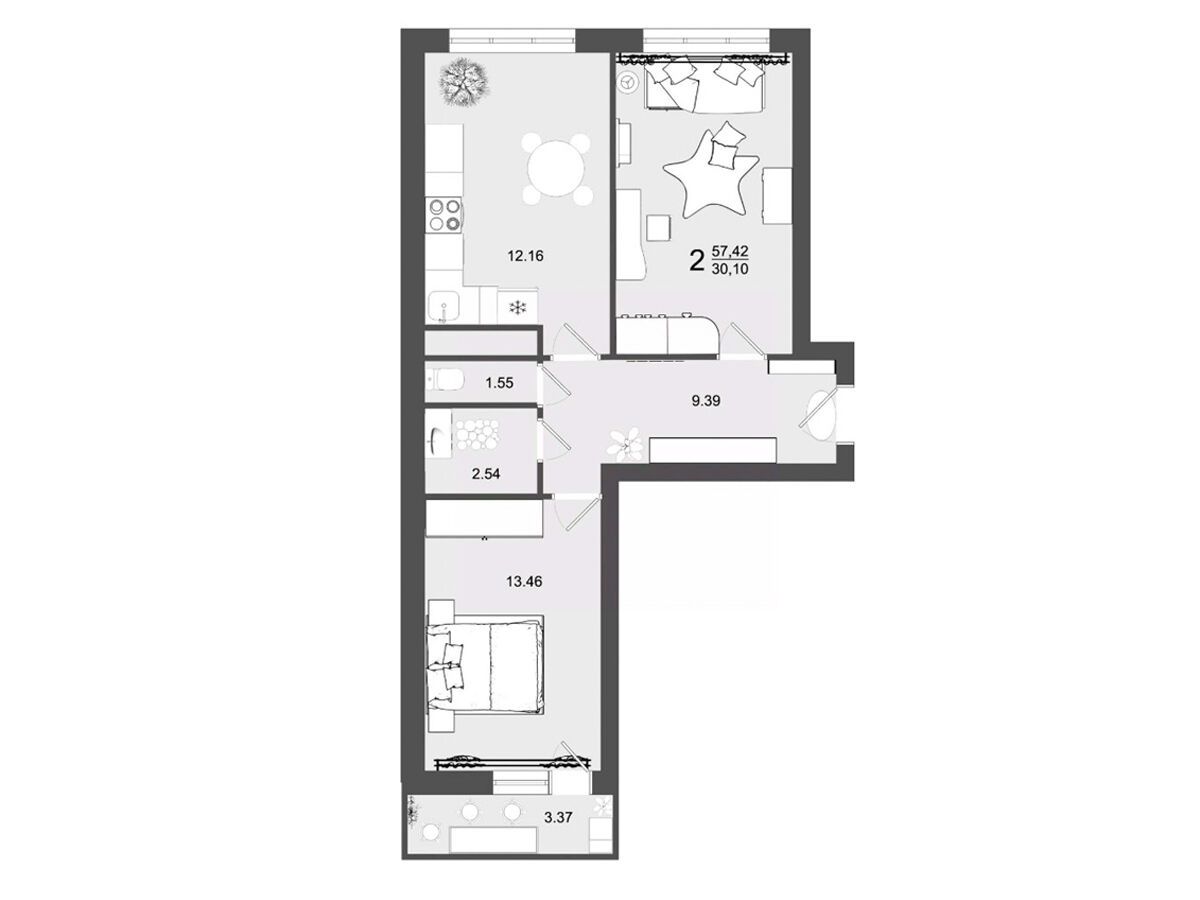 2-комнатная квартира, 54.69 м², 7 из 9 эт.