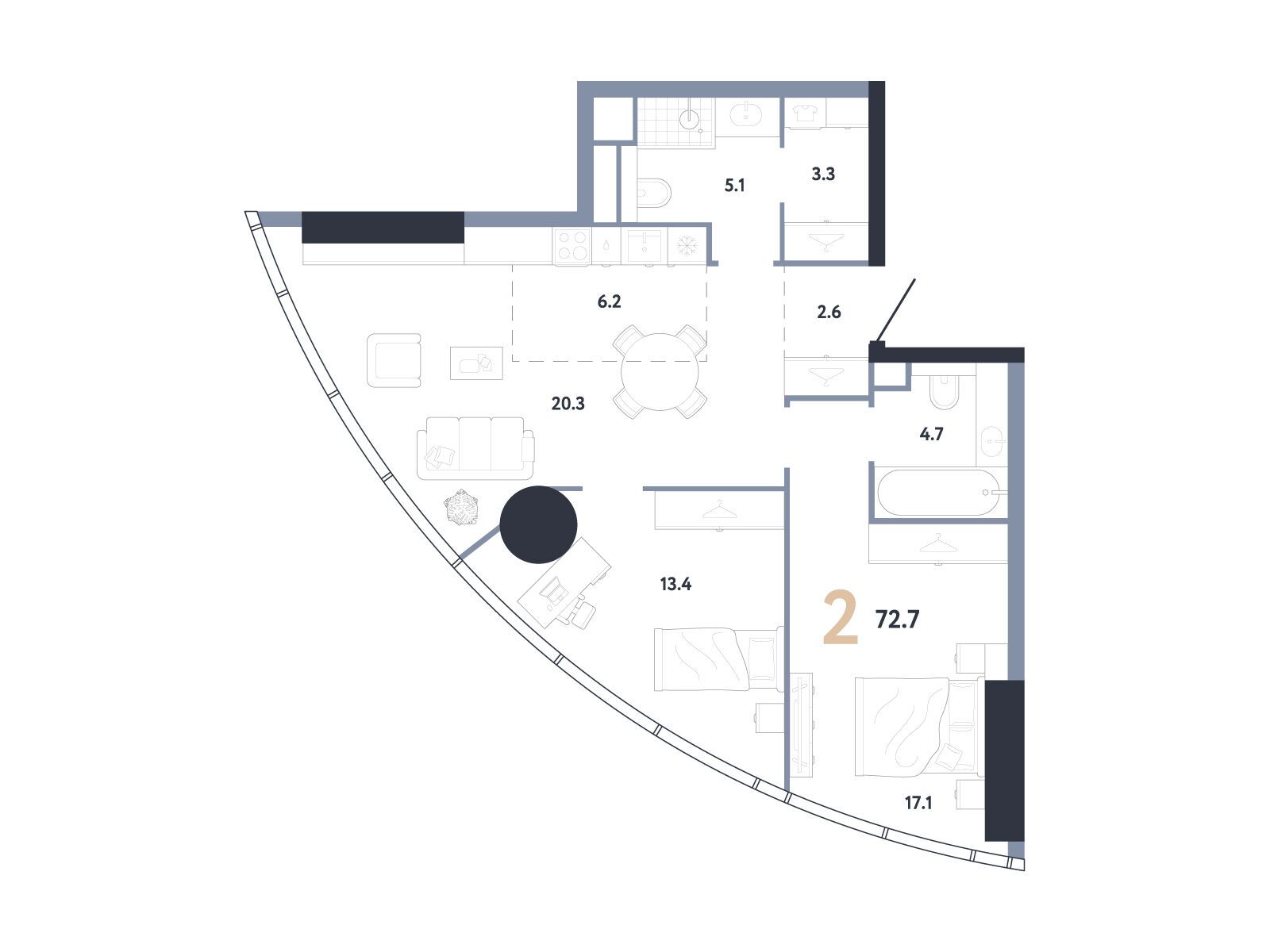 2-комнатная квартира, 72.70 м², 48 из 95 эт.
