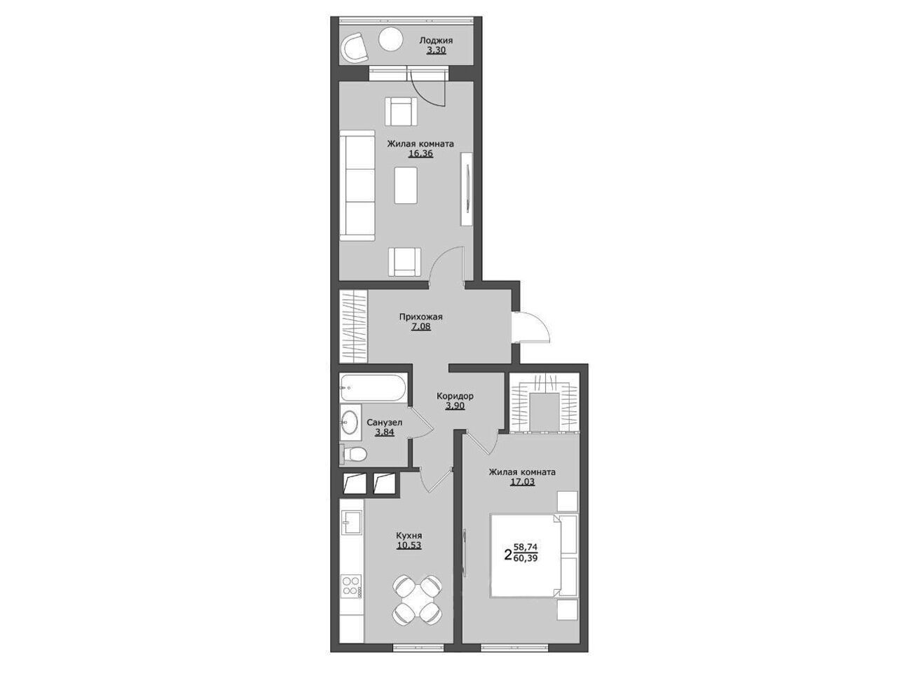 2-комнатная квартира, 60.39 м², 6 из 9 эт.