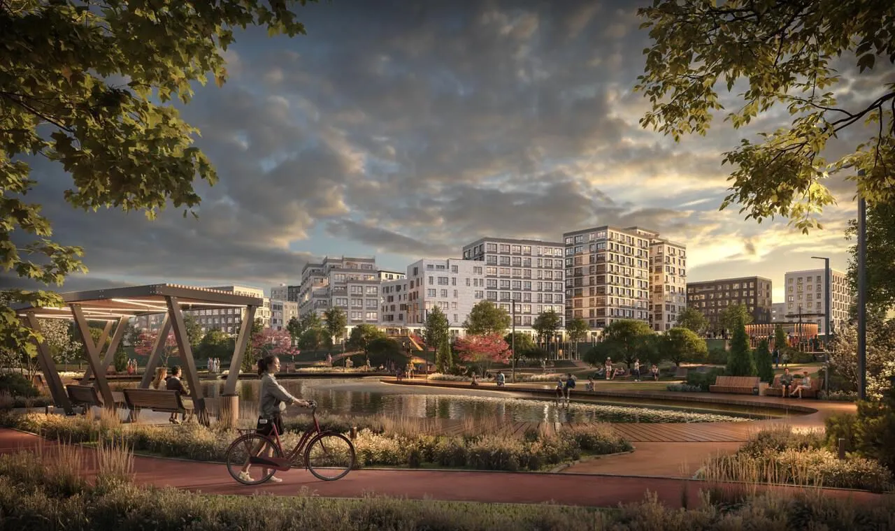 Территория комплекса благоустроена по концепции «двор без машин»: все парковочные места вынесены за пределы жилой зоны, а внутренние пространства отданы под зоны отдыха и детские площадки. В центре двора расположен ландшафтный парк с прогулочными аллеями, зонами для пикников, скамейками и фонтаном. Для детей созданы игровые комплексы с безопасным покрытием, для взрослых — зоны воркаута и площадки для йоги, а для любителей активного отдыха проложены велодорожки и беговые маршруты. Рядом с комплексом формируется набережная вдоль Москвы‑реки с пешеходными и велосипедными дорожками, местами для отдыха и причалом для маломерных судов.