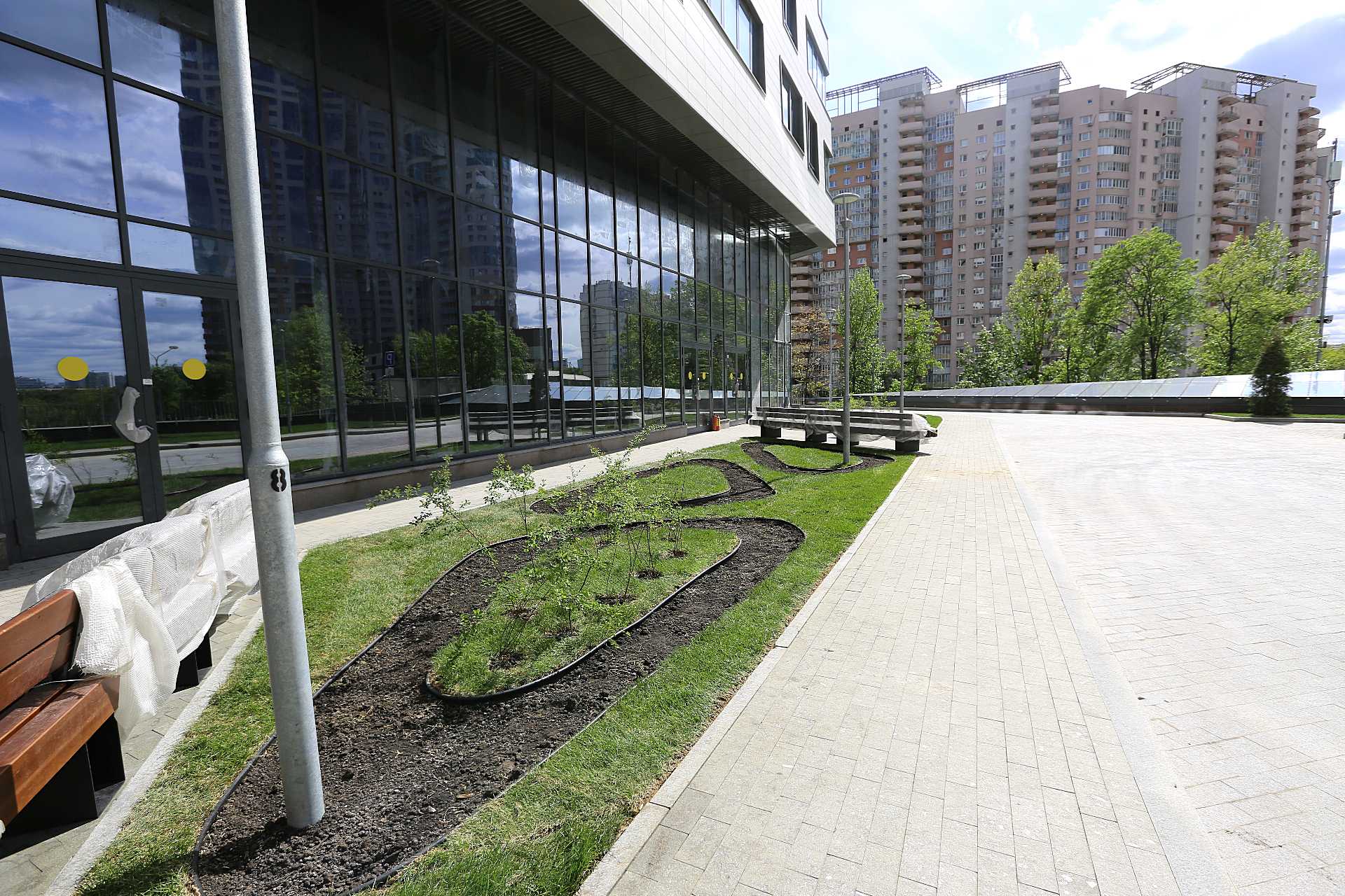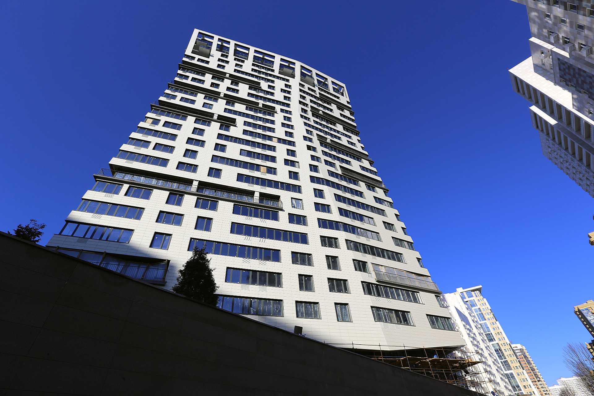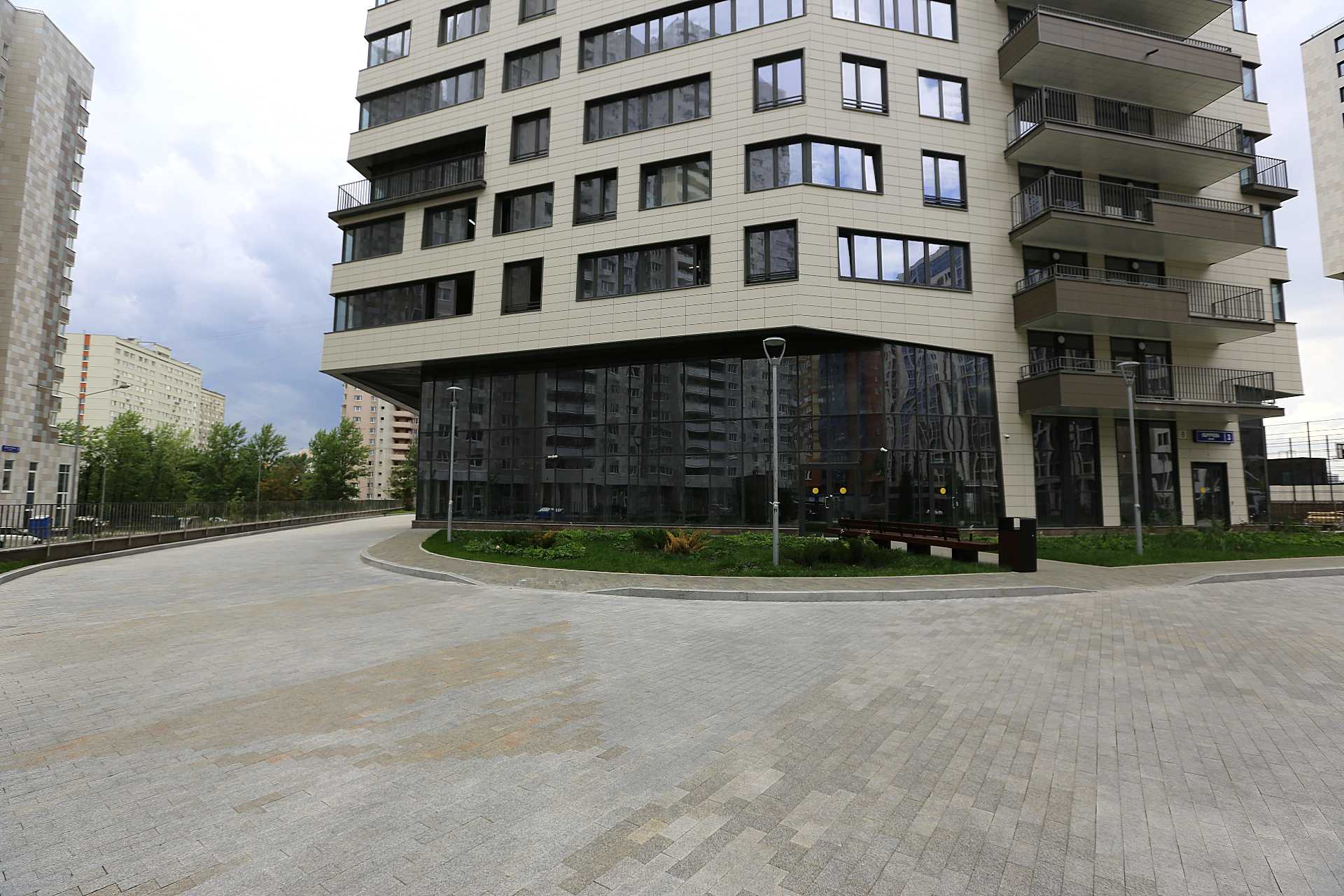 Дом с интересной подсветкой, которая создаёт уютную атмосферу вечером. Рядом зелёные аллеи и клумбы, а также детский городок, где мои дети любят играть. Однако на мой взгляд, забор вокруг территории немного портит общий вид. Он кажется устаревшим и не сочетается с современными домами. Ещё один минус — это количество лифтов. Их недостаточно для такого количества квартир на этаже, особенно учитывая высокую этажность здания. Иногда приходится ждать лифт слишком долго, особенно утром, когда многие спешат на работу. Под домом расположен торговый центр, а рядом парк. Это удобно, так как можно совершать покупки, не выходя из дома, и гулять в парке в свободное время.