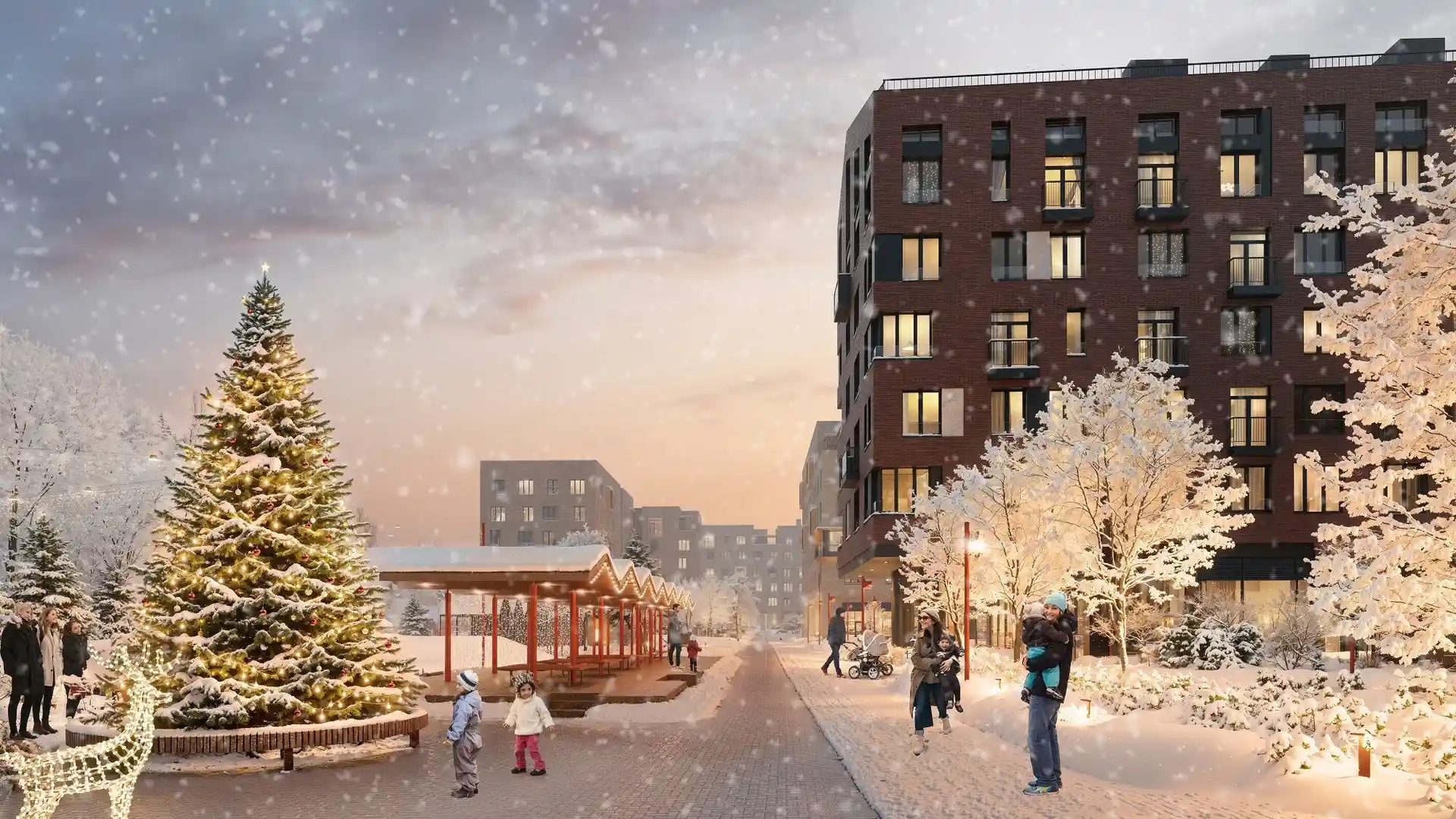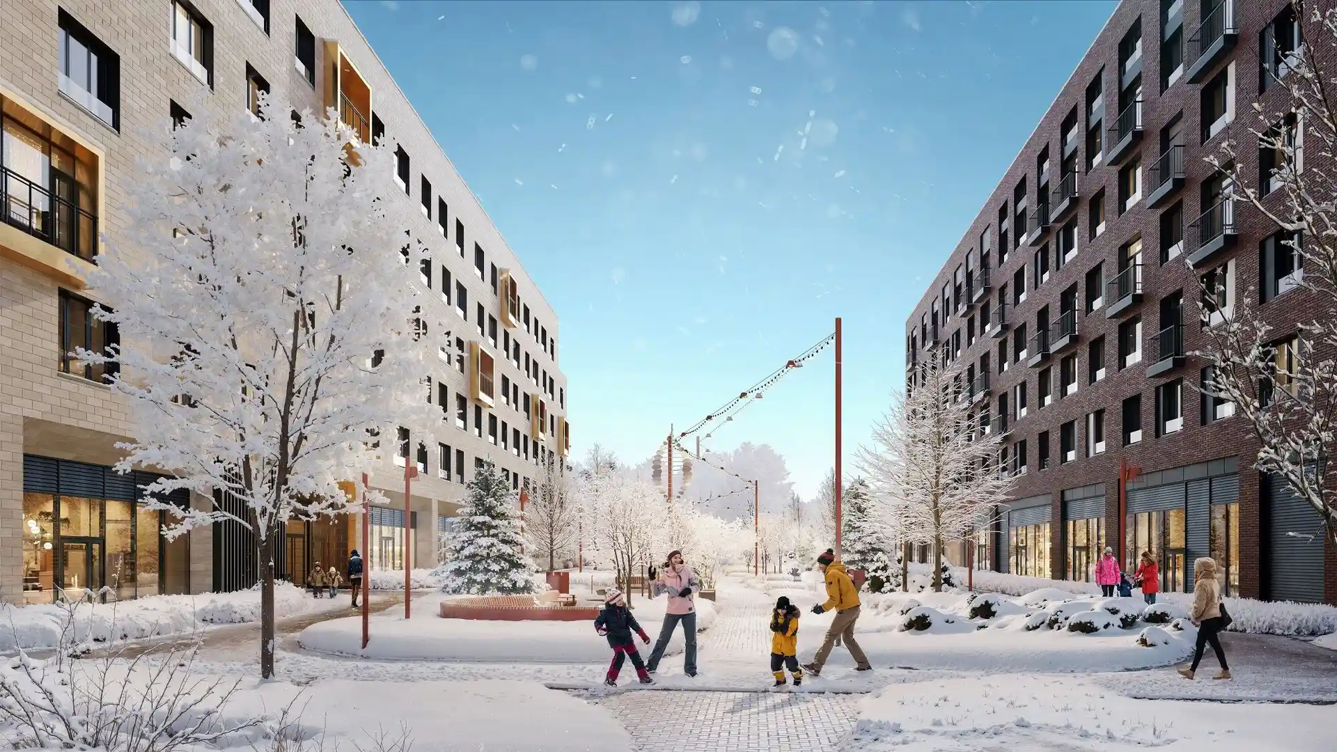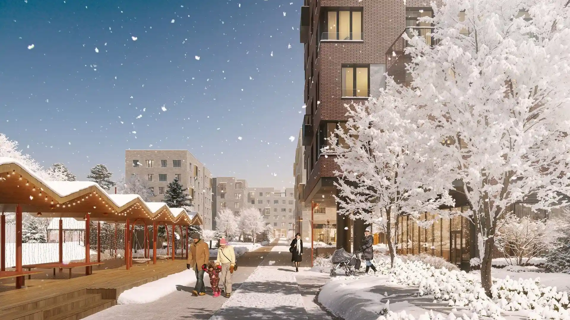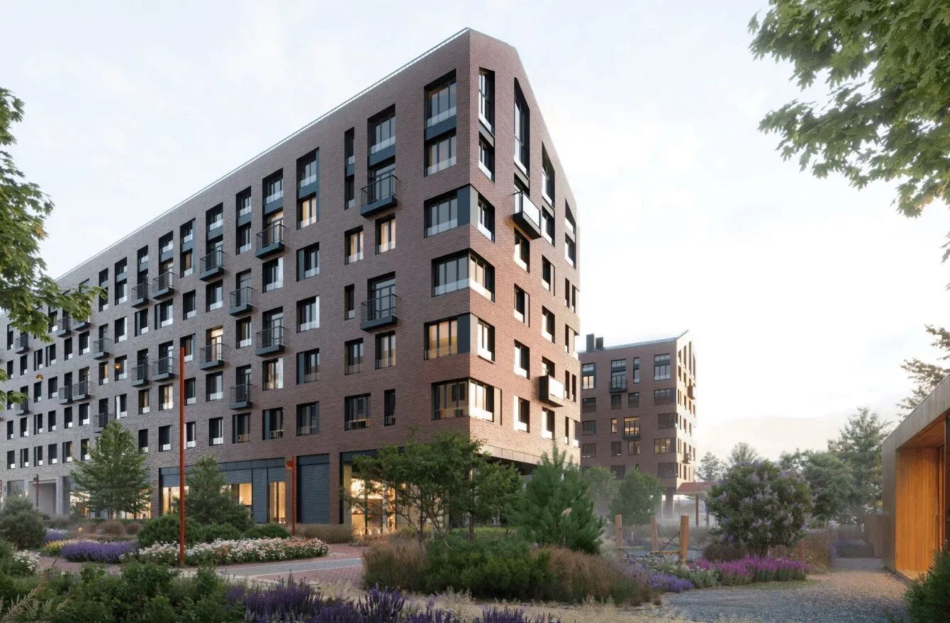 В комплексе планируется построить 5 корпусов высотой от 4 до 6 этажей. Низкая этажность создаст ощущение уюта, а кирпичные дома со скатными крышами напомнят загородные кварталы Северной Европы. Современные здания будут украшены панорамными угловыми окнами, французскими балконами и открытыми террасами. Все квартиры будут иметь красивый вид на благоустроенный двор, реку или парк.