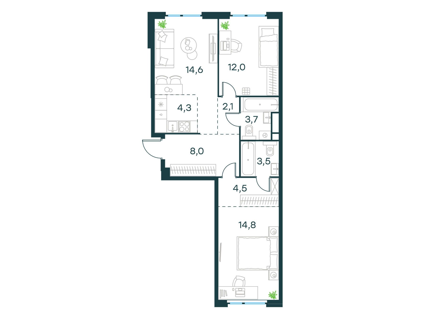 В домах 3 и 4 этапа предлагаются квартиры площадью от 18 до 92 кв. метров, с классическими планировками и евро-формата. Есть варианты с угловым остеклением, с эркерами, а также квартиры с комнатами нестандартной формы. В многокомнатных квартирах предусмотрены дополнительные санузлы и места для хранения.