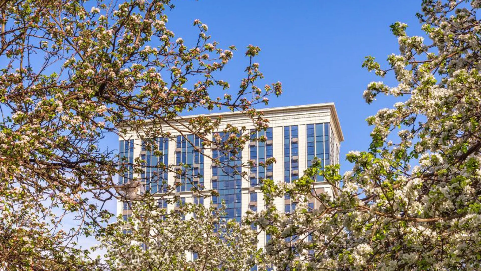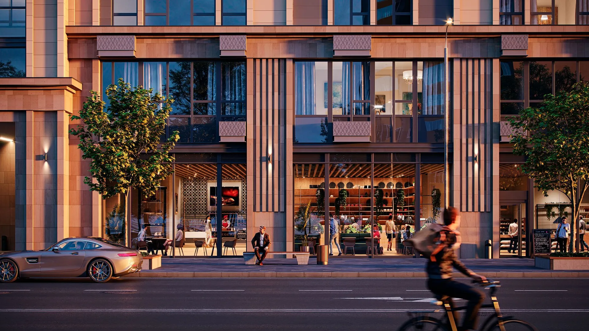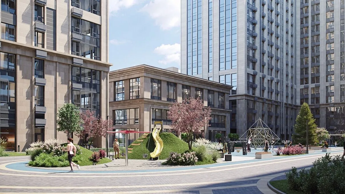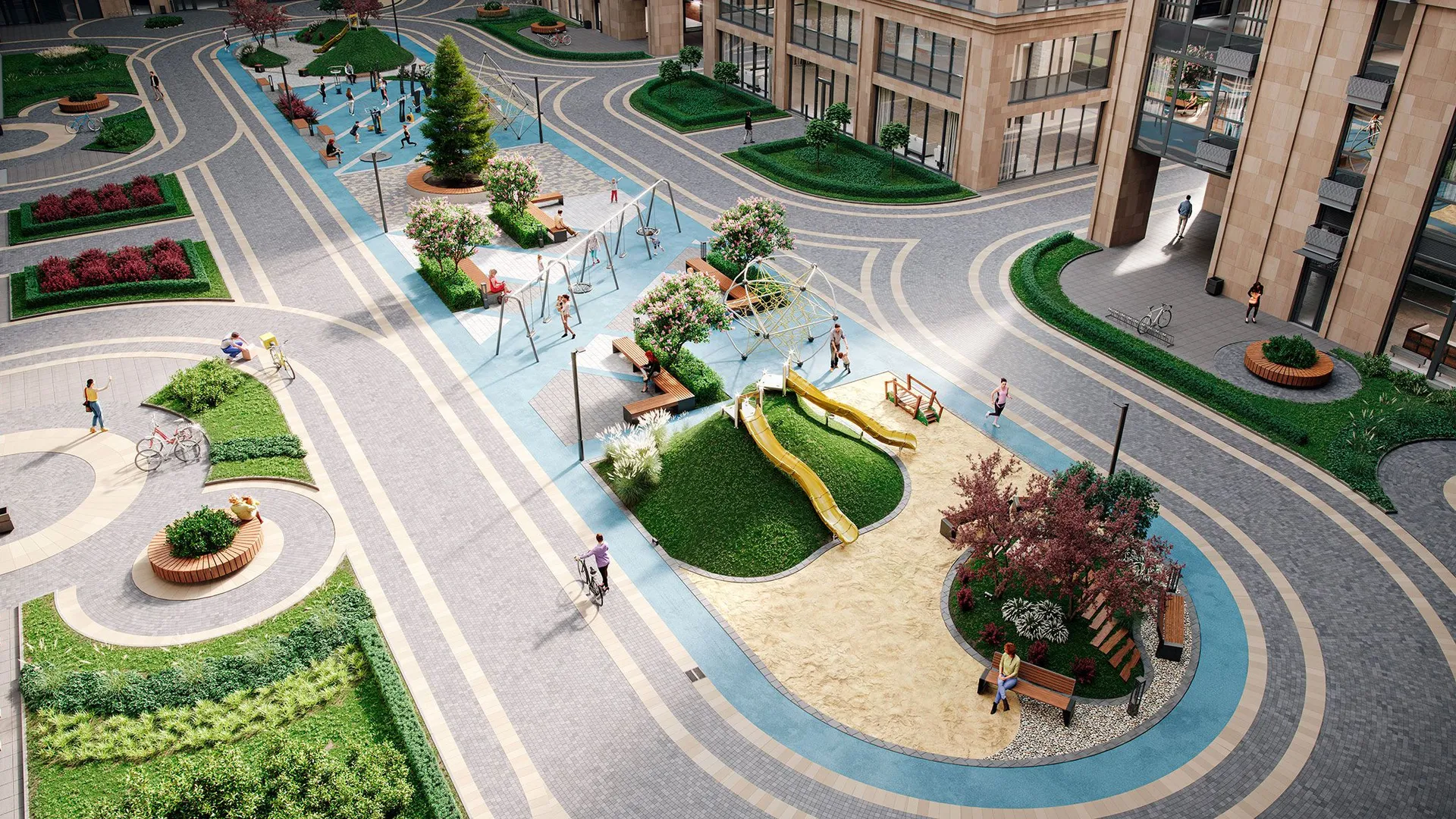 Территория комплекса закрыта и благоустроена: во дворе без машин выполнено ландшафтное озеленение, установлены детские и спортивные площадки, зоны отдыха и велопарковки. Для автовладельцев предусмотрен трехуровневый подземный паркинг на 1602 машино‑места с автомойкой и прямым доступом на лифте из здания.