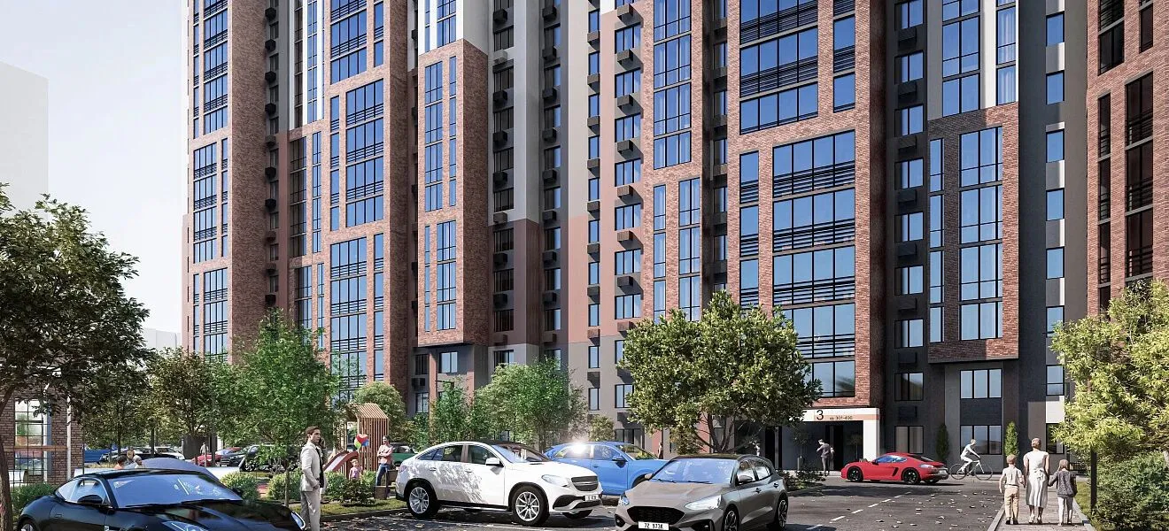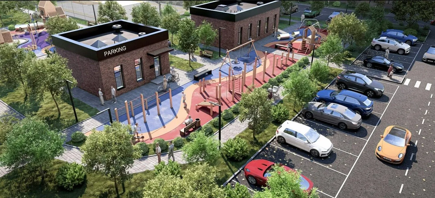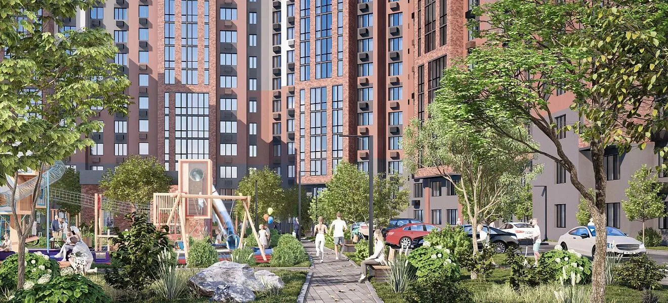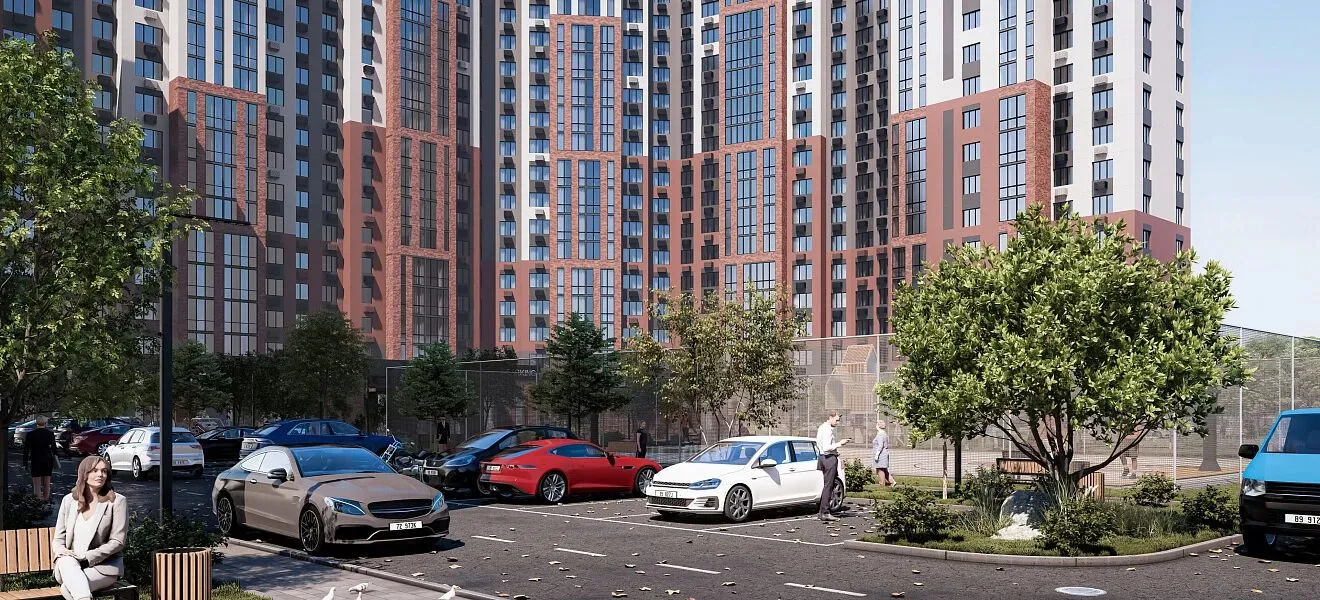 Территория ЖК закрыта от машин. Во дворе обустроен приватный пешеходный двор-парк со сквером, украшенным всесезонной растительностью. Здесь разместятся детский игровой городок, спортивное оборудование, лавочки, дорожки для прогулок и площадка для командных игр (футбола и баскетбола).